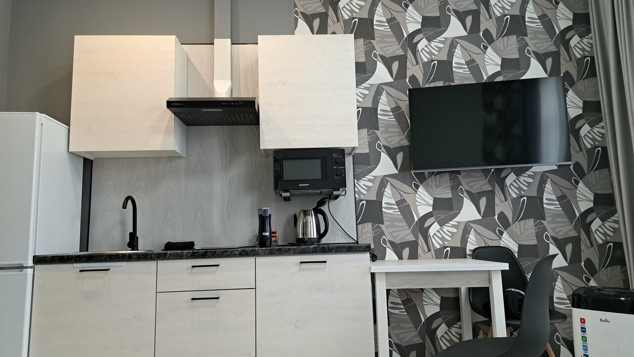 Отличные апартаменты. Останавливались семьей, все понравилось. Есть кухня.