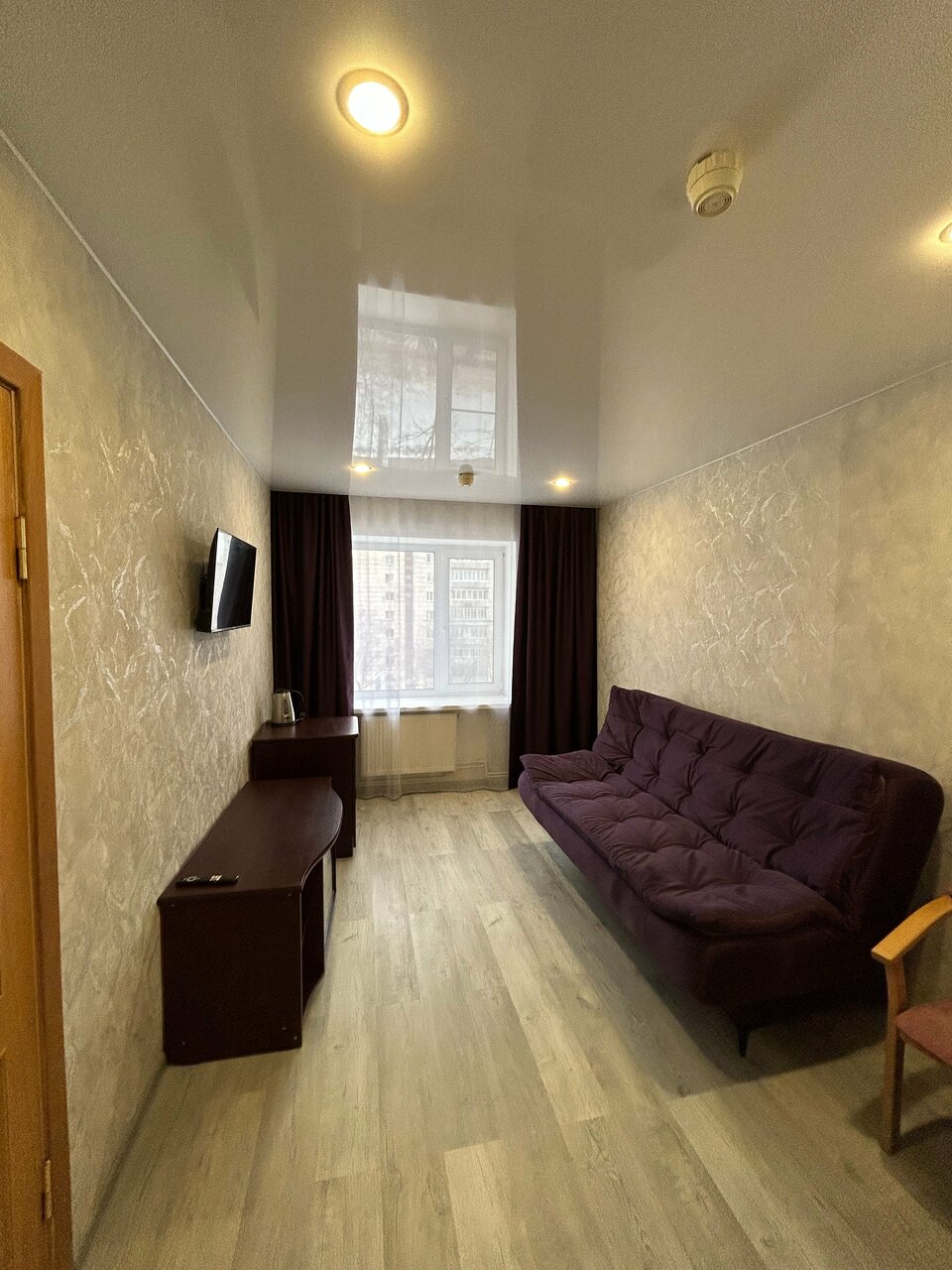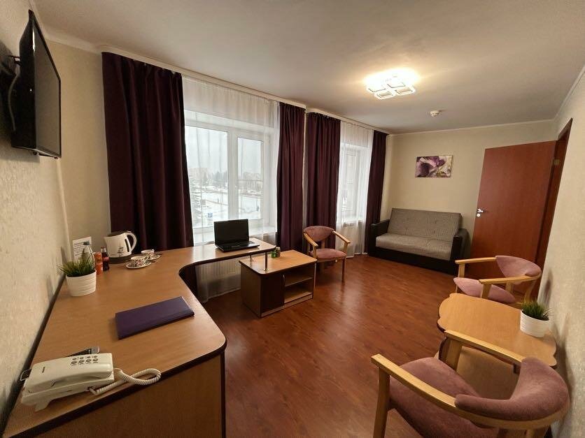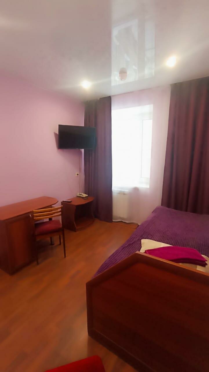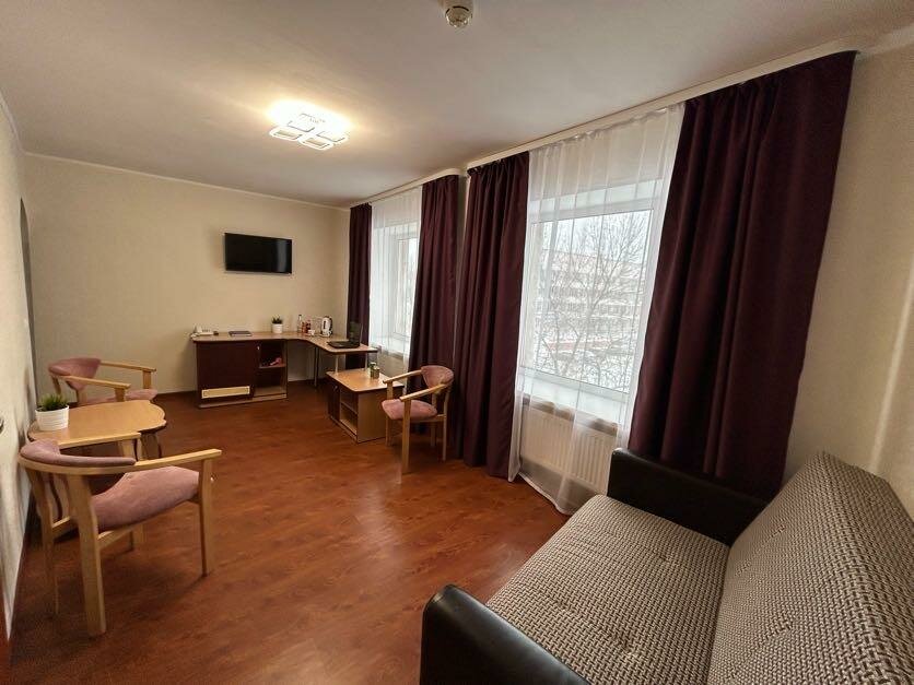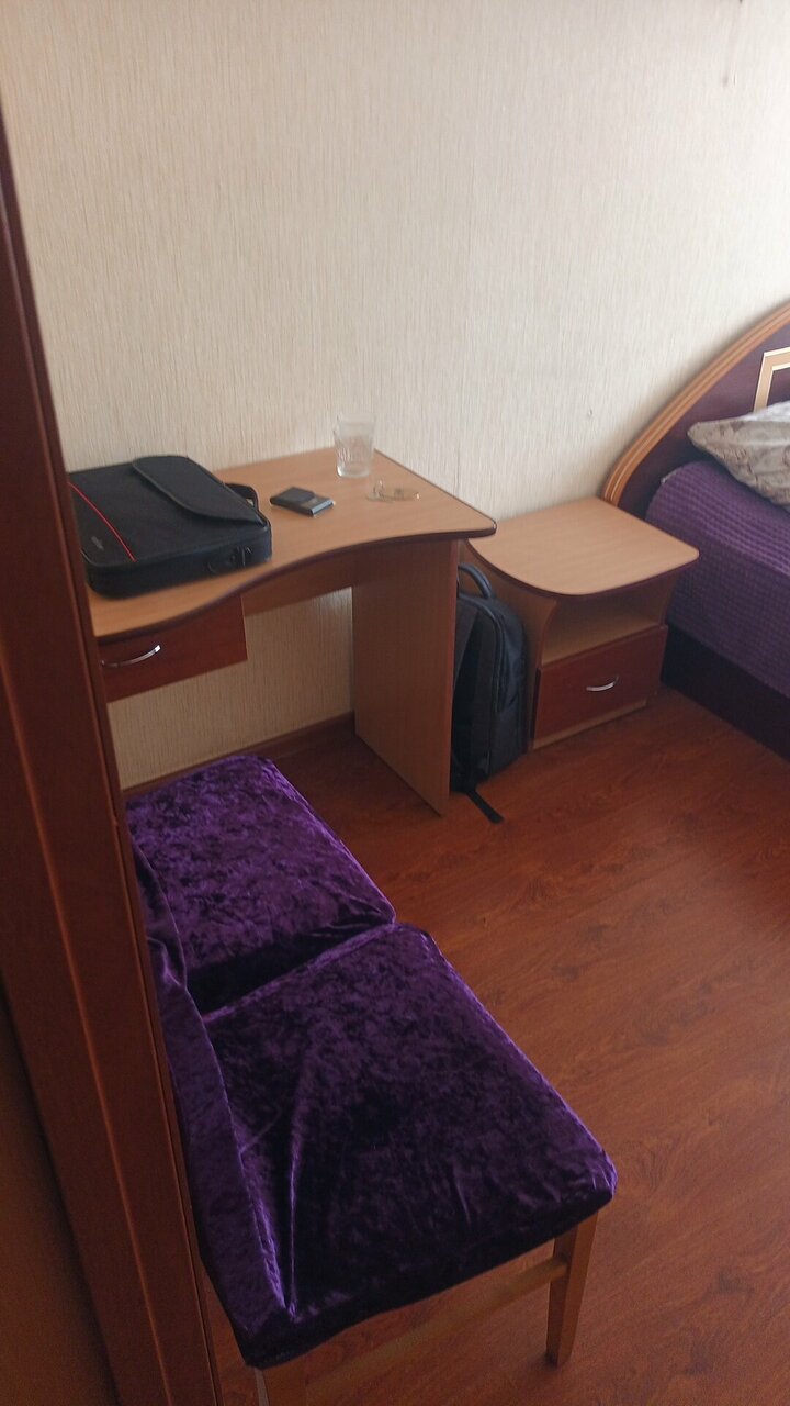 Неожиданно пришлось остановиться здесь на 2 суток. Из всех гостиниц Тихвина свободный номер на троих был только здесь. Разместили нас на 5 этаже в номере с двухспальной кроватью и диваном. В глаза сразу бросились клубы пыли везде: ножки стульев, вдоль стен, на полу. Стаканы были грязные, сан узел тоже хотелось бы почище. На следующий день попросили убраться в номере, стало чище, но далеко не идеал, в спальню как будто бы не заходили совсем. Огромный минус это количество розеток. На одну розетку холодильник и чайник, приходилось переключать. Из свободных была только одна розетка в спальне, а троим взрослым необходимо было заряжать телефоны, очень неудобно! В номере отсутствовал пульт от телевизора и фен. Выдали по просьбе. Выданный одноразовый шампунь был больше похож на мыльную воду и совсем не пенился. Ощущения чистой головы не по появилось. За двое суток полотенца не менялись. Пришлось оставить подарок.