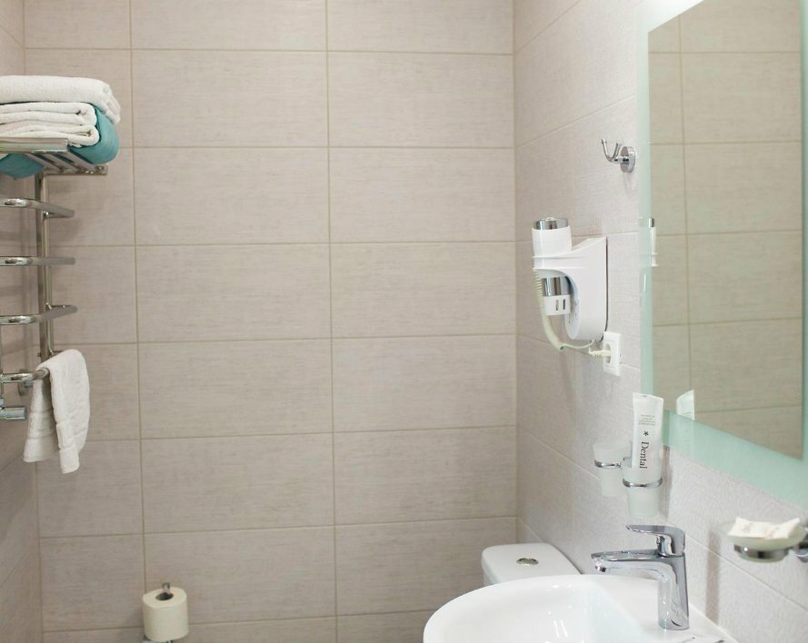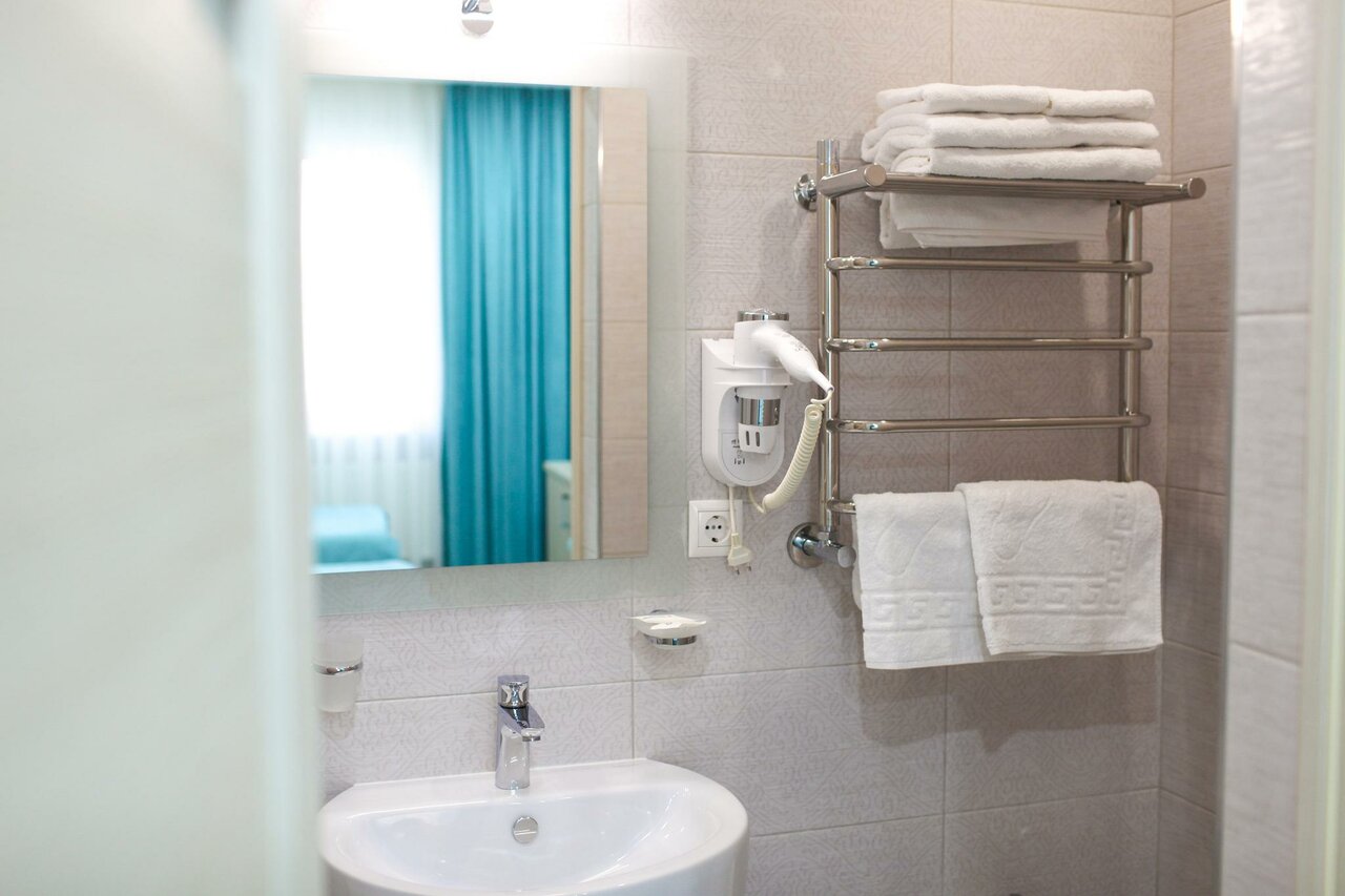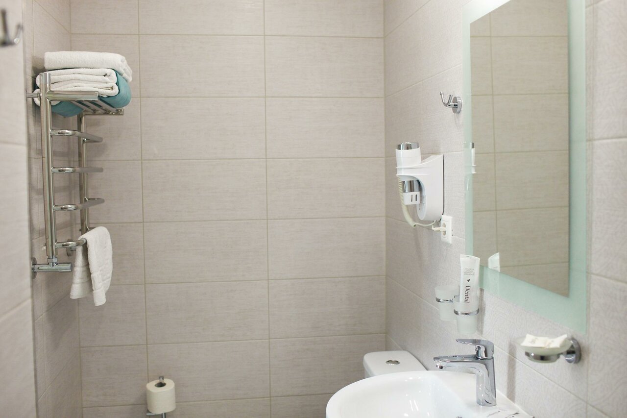 Отличные номера, на пять звёзд!! В душе лежат Саше с мыльными принадлежностями, есть фен, туалетная бумага, белые полотенца, горячий полотенцесушитель. В комнате есть маленький холодильник, вилки , ложки, чайник.
