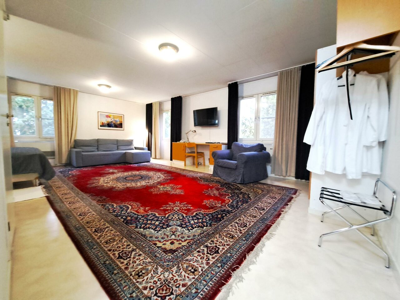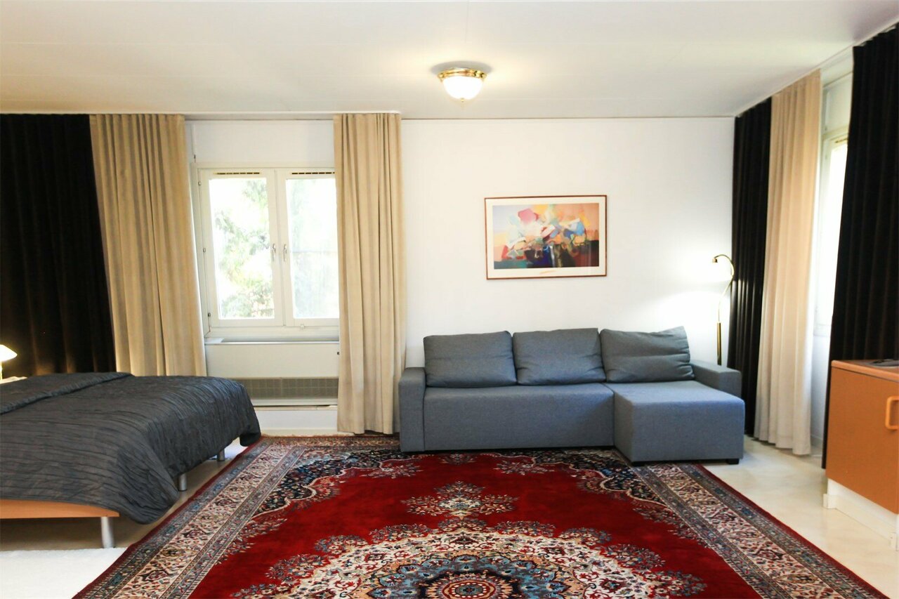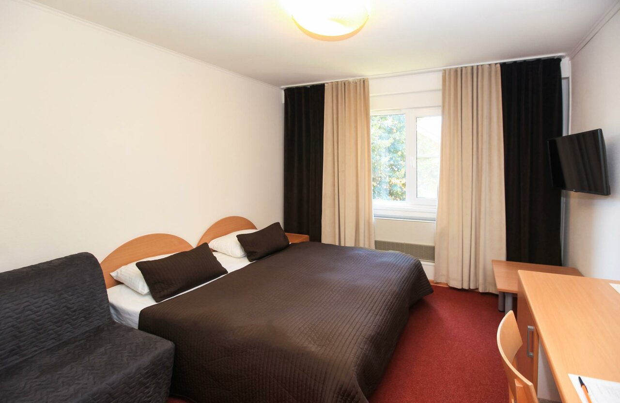 В номере Стандарт трехместный есть всё необходимое для комфортного проживания: двуспальная кровать с ортопедическим матрасом, раскладное кресло-кровать, кабельное тв, wi-fi, мини-холодильник, рабочий стол, сплит-система, набор полотенец и косметич...