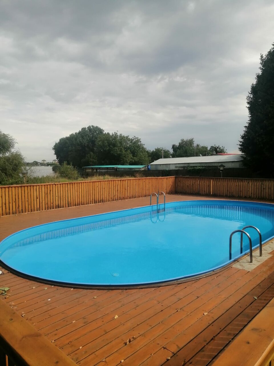 Оценивал базу отдыха. Довольно уютные номера, есть кондеры в номерах и коридорах. Чистые комнаты и ванные комнаты. Хороший бассейн, есть спуск к реке. Завтраки обычные, ничего особенного.