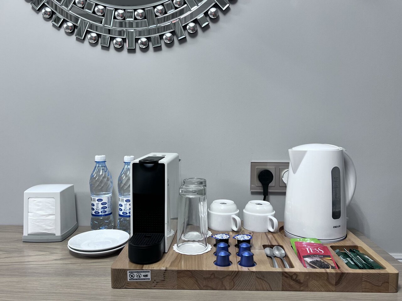 Расположение хорошее, номер чистый , тихо, все что нужно есть. Кофе машина со вкусным кофе , удобные кровати. Одеяла конечно не очень. В номере нашем маленькое окно и душно было. Включили кондиционер , не работают , течет. Завтрак не вкусный овощи залежалые никаких блюд из яиц. Да и вообще в Торжке с ресторанами и кафе проблема. А и еще зачем то у нас в поставили вигвам). Не поняли для кого .. да и админы совсем не приветливые На 4 звезды не очень тянет по сервису .. и табличка в номере в номере не есть .. так тогда должно быть кафе или бар