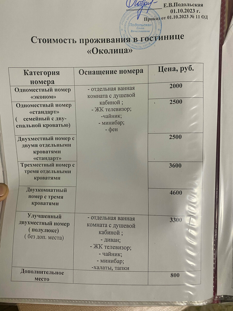 - Дополнительная плата за раскладушку (800 руб.).
