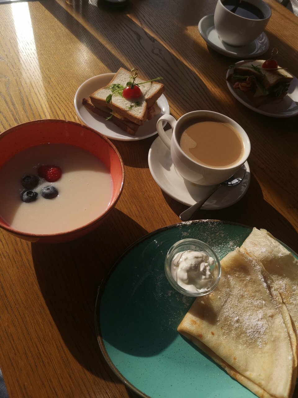 Оценка только ресторану. В гостинице не был. Обстановка уютная. Обслуживание крайне медлительное. Вкусные сырники. Блины были вчерашние, шарлотка сухая. Кофе приготовили неплохо. Счёт просили три раза, в итоге сам пошёл на кассу, хотя времени было 9 утра. Надеюсь в более людное время работает больше персонала. На обратном пути хотел заехать снова, но что то не рискнул.