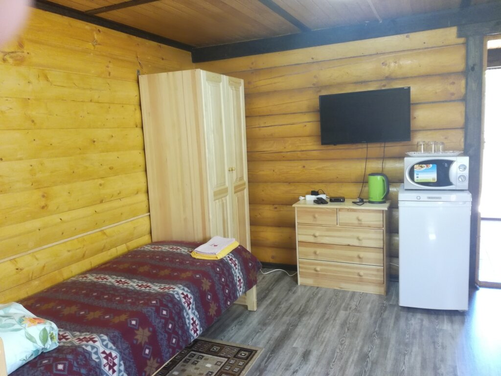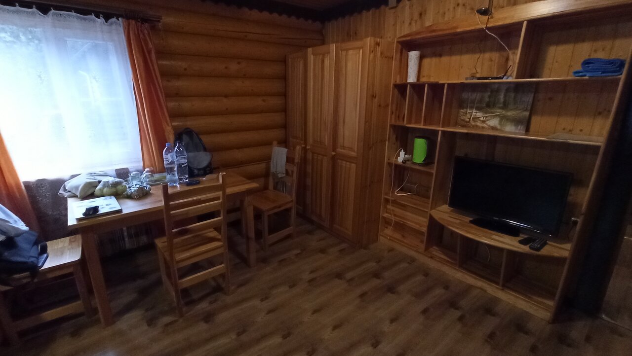 Недостатки: проблеммы с сантехникой (не фиксируется ручка смесителя, засорена раковина). Вентиляционных каналов нет в санузле и в комнате. Дешёвые синтепоновые подушки и одеяло. Преимушество: комплектация номера с микроволновкой, чайником, кружками, микроволновая печь, холодильник, шкаф, телевизор с триколором, открытый шкаф и полками и ящиками, стол, стулья, в санузле имеется биде. На территории трактир, баня, сауна, спортивный зал.