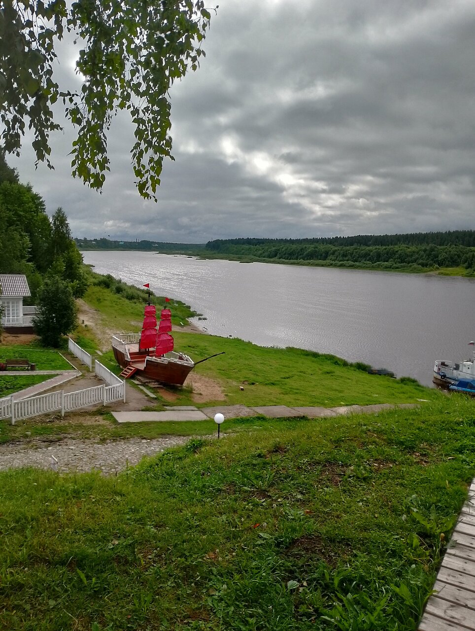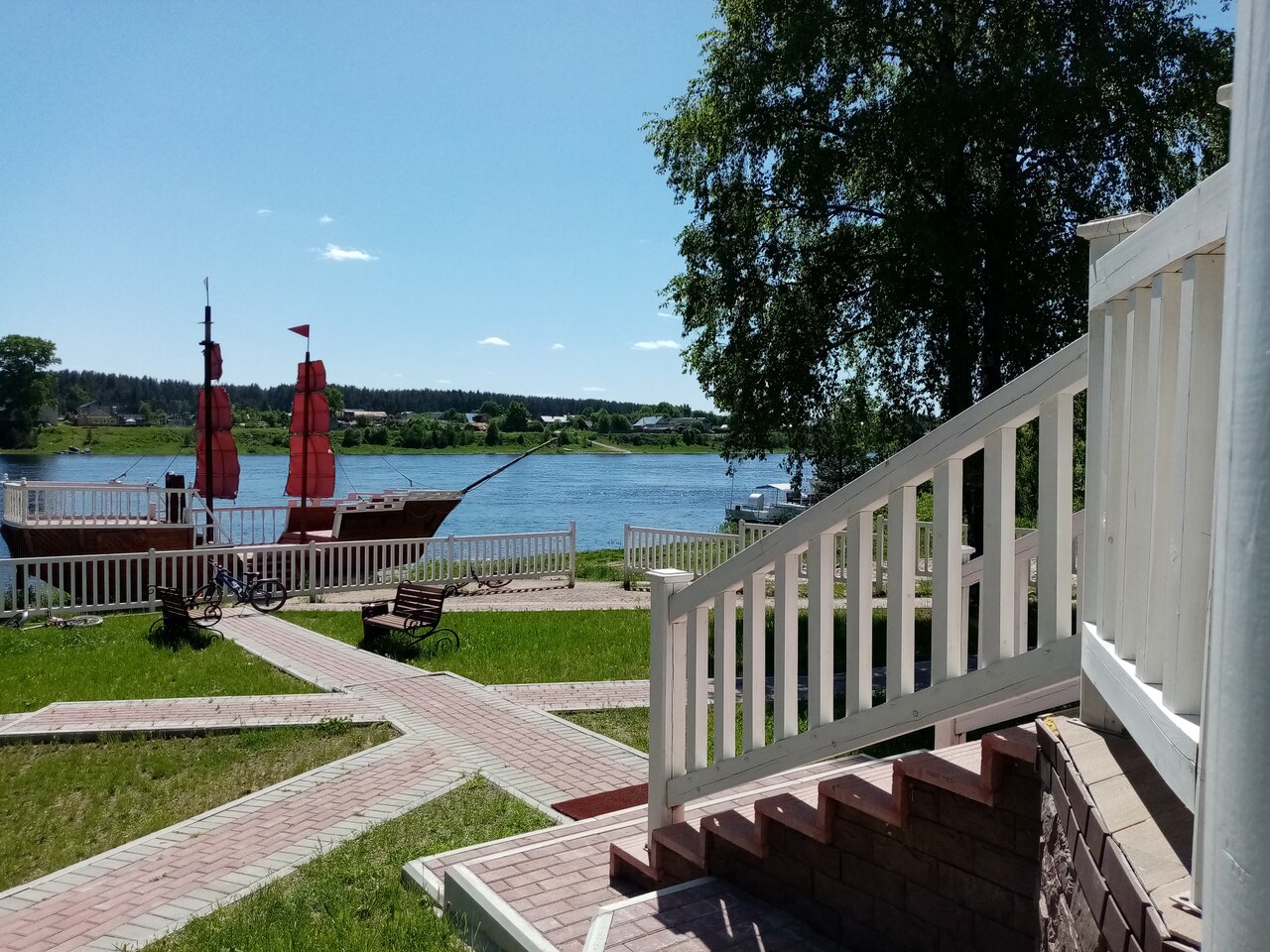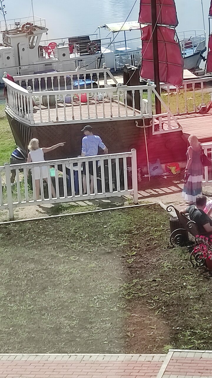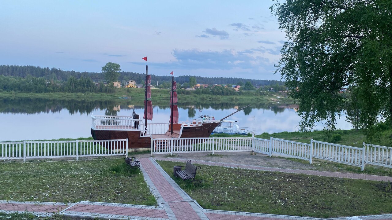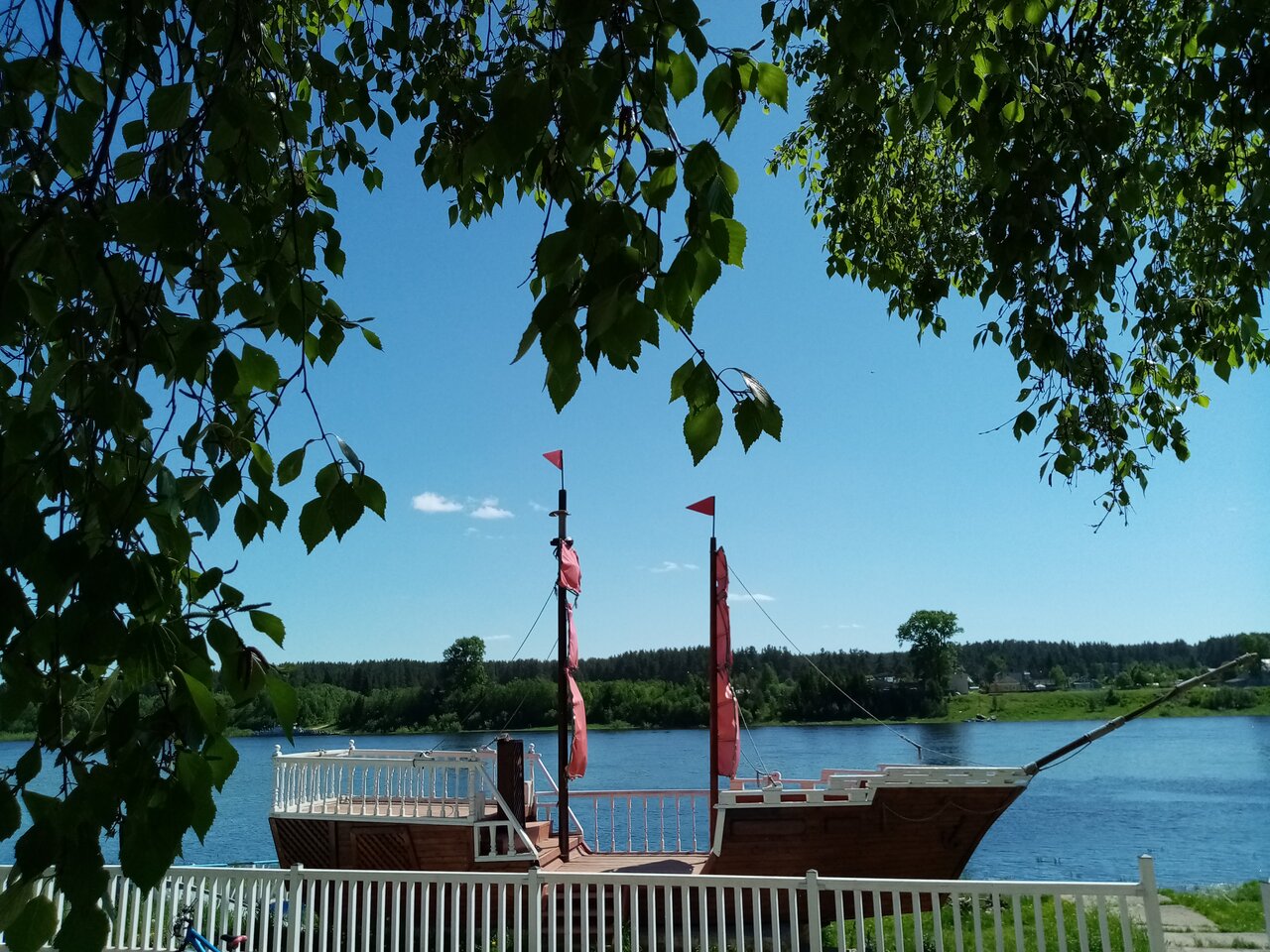 Берег реки, парусник, уютно, чисто, приветливый персонал. Очень понравилось.