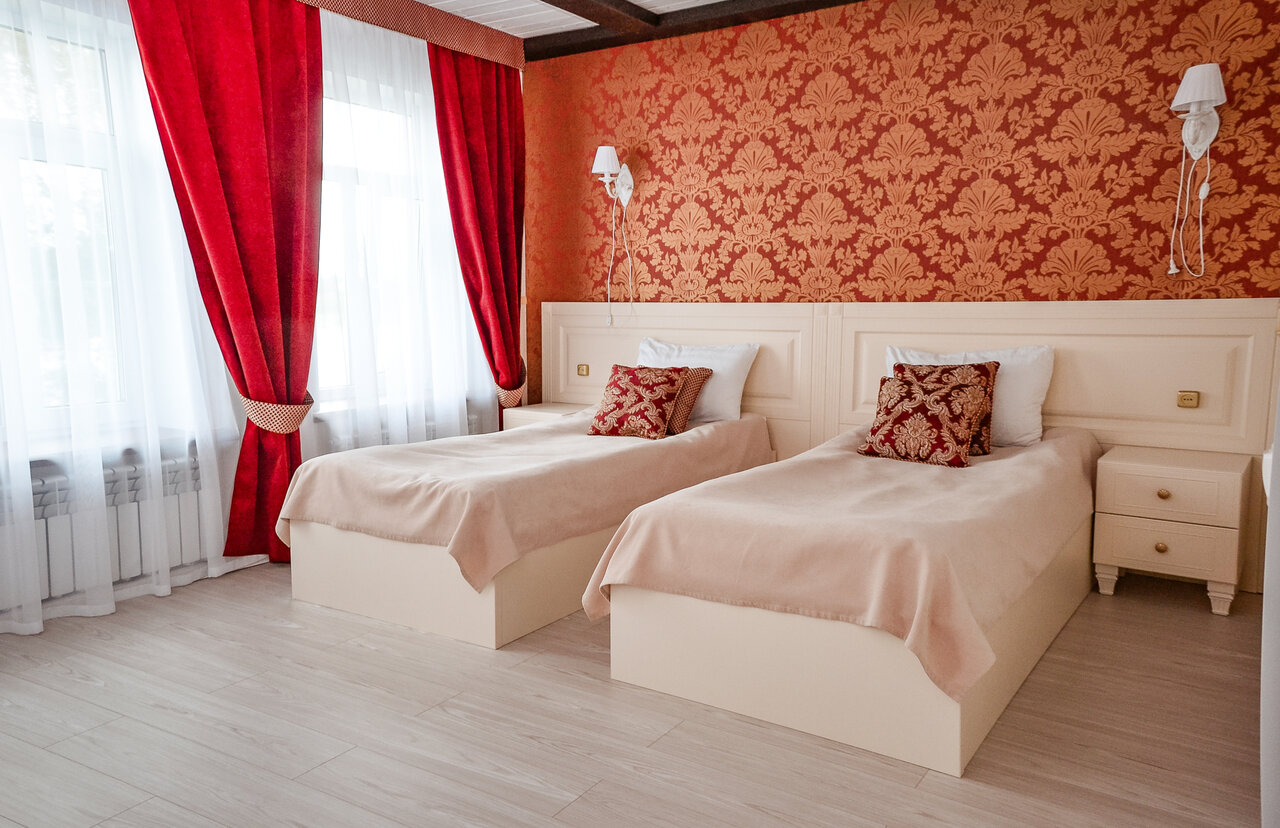 Двухместный номер с раздельными кроватями с возможностью установки дополнительного спального места. В ванной душ и туалет. Предоставляются туалетно-косметические принадлежности, фен.