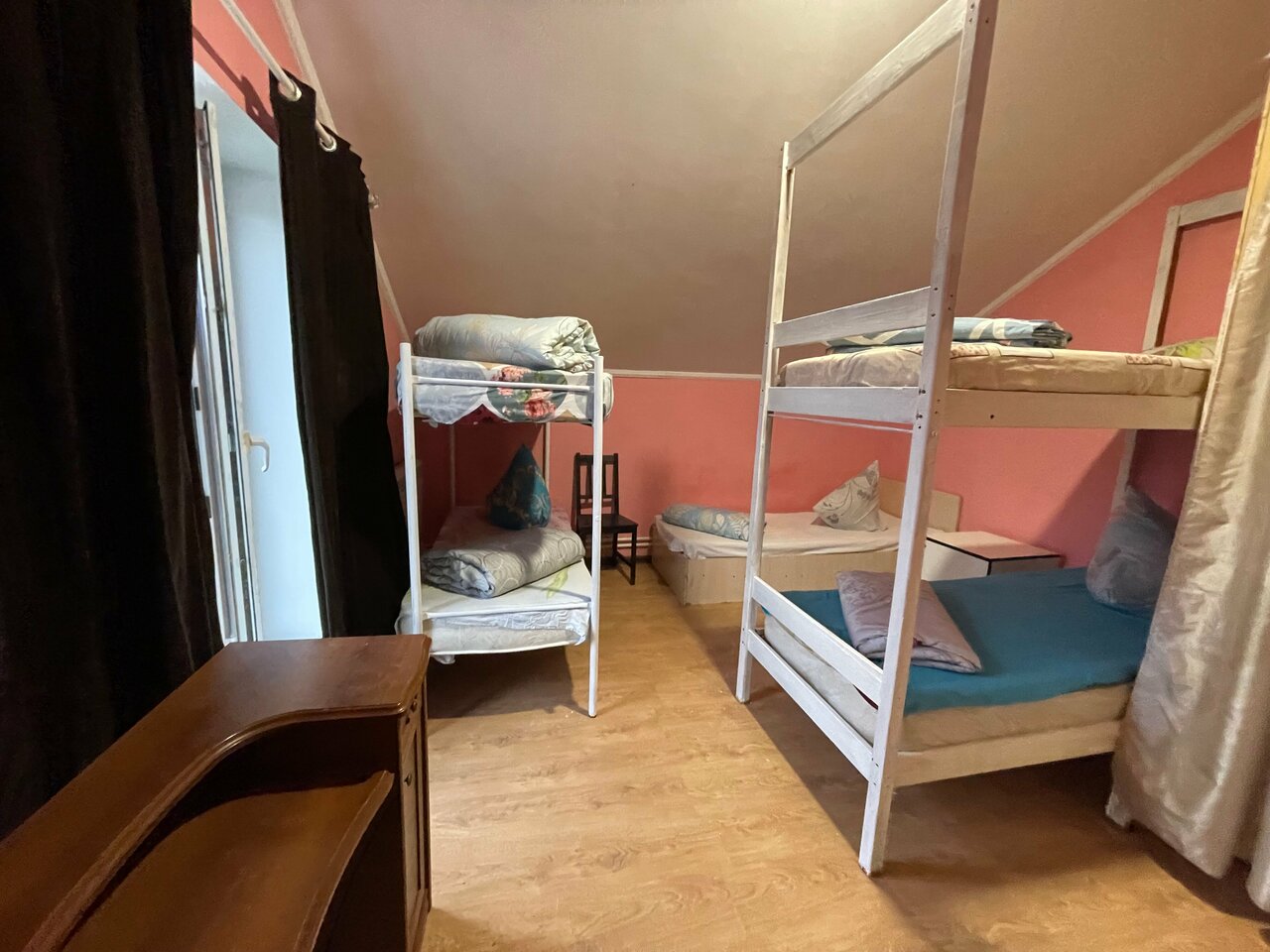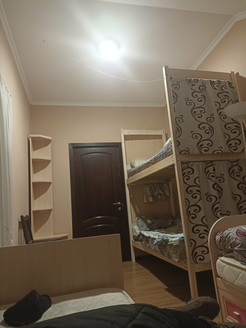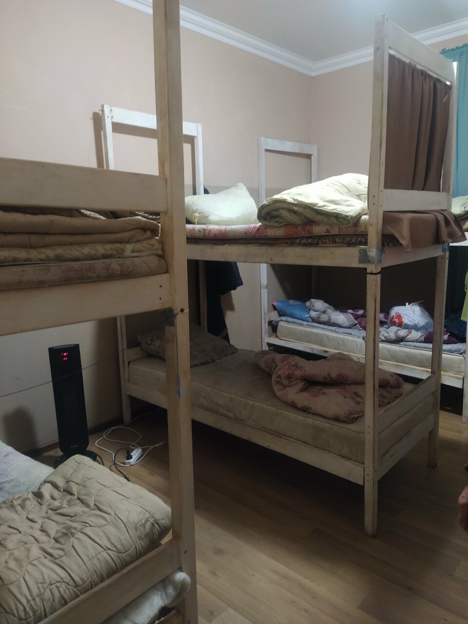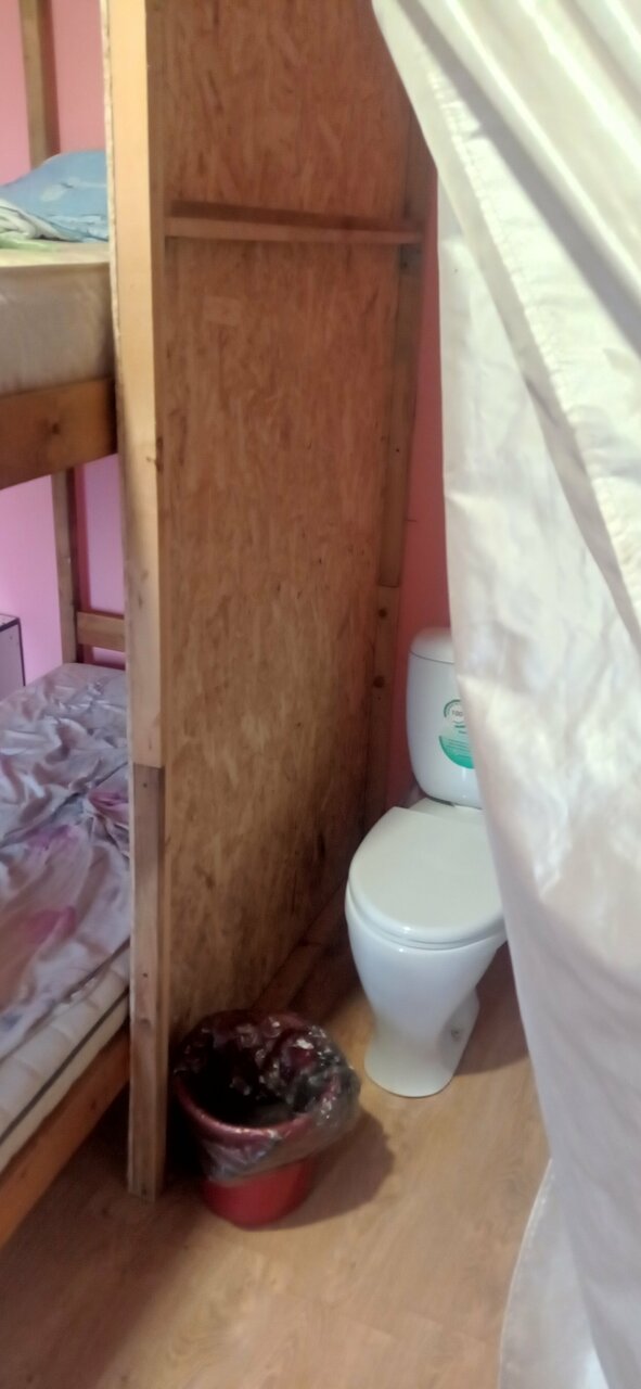 Останавливались на 1ночь, поселили на 2этаже. Это ужасно… Организаторы, неужели вам не стыдно предоставлять такие условия? Во-первых непонятная вонь во всем хостеле, невыносимая. Вопрос решили проветриванием и половиной баллончика освежителя. Во-вторых, грязные стены и мебель, а туалет за шторкой это ‘гениально’! В третьих, убитые годами матрасы — пружины так и пытаются вырваться из этого места, а грязная обивка их не пускает. Вата в подушках воняет, скомковалась, наверное, года два назад, спали свернув одежду под голову. Постельное белье тоже не меняли лет 5… Самое лучшее, что здесь есть — безобидные тараканы, они нас не трогали, просто бегали рядом. Звезда только за приветливый персонал.