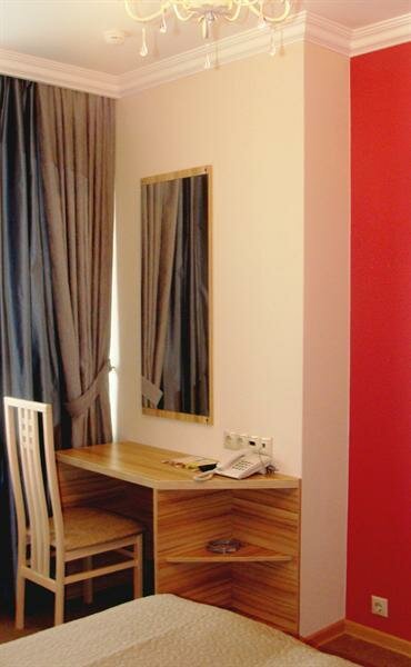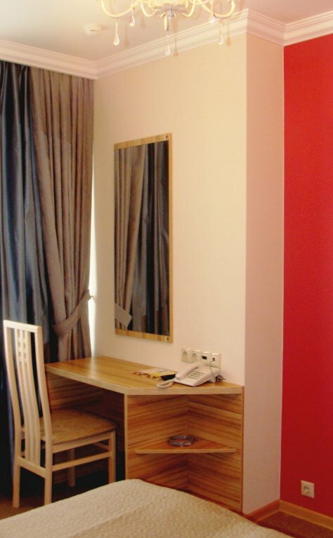 Современный яркий номер с оформлением в брусничном цвете.Оборудован большой кроватью, прикроватными тумбочками, вместительным шкафом, универсальным столом со стулом, ЖК телевизором, кондиционером, сейфом, телефоном с прямой международной линией....