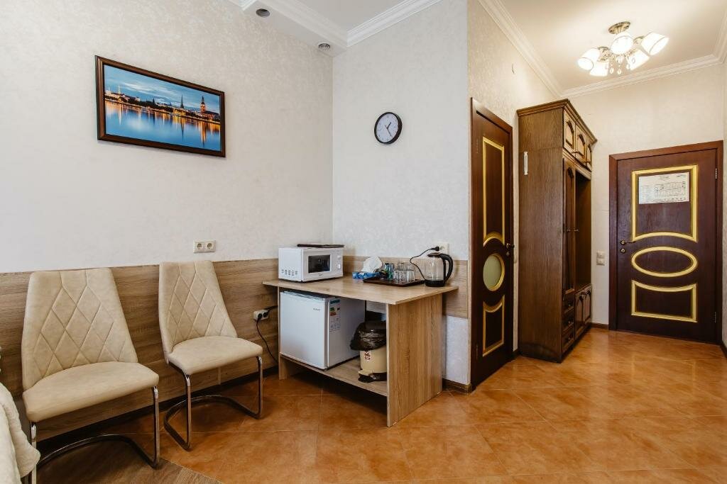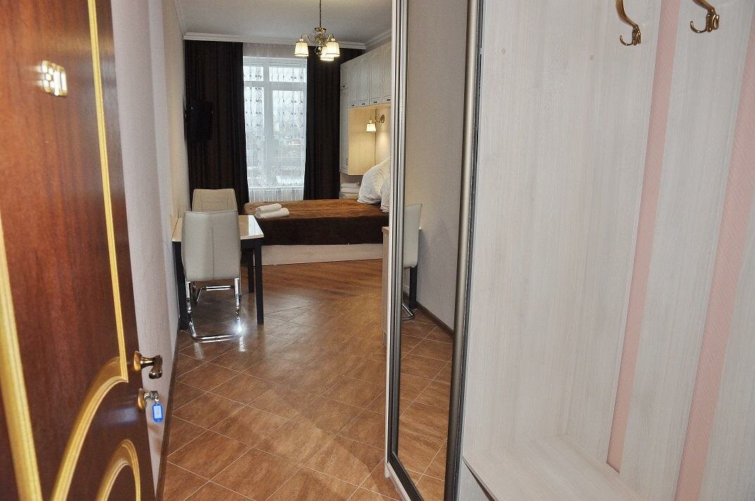 Номер 23 кв м с душем, большой кроватью, с возможностью расположиться на доп месте.Завтрак включен в стоимость!В номере кухня, вся необходимая посуда, холодильник, телевизор, фен, халаты, тапочки, гигиенические наборы.