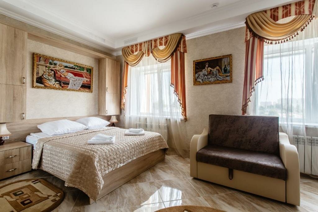 Номер 26 кв м площади с душем, одной большой кроватью, с возможностью расположиться на доп местеЗавтрак включен в стоимость!В номере холодильник, телевизор, фен, халаты, тапочки, гигиенические наборы.