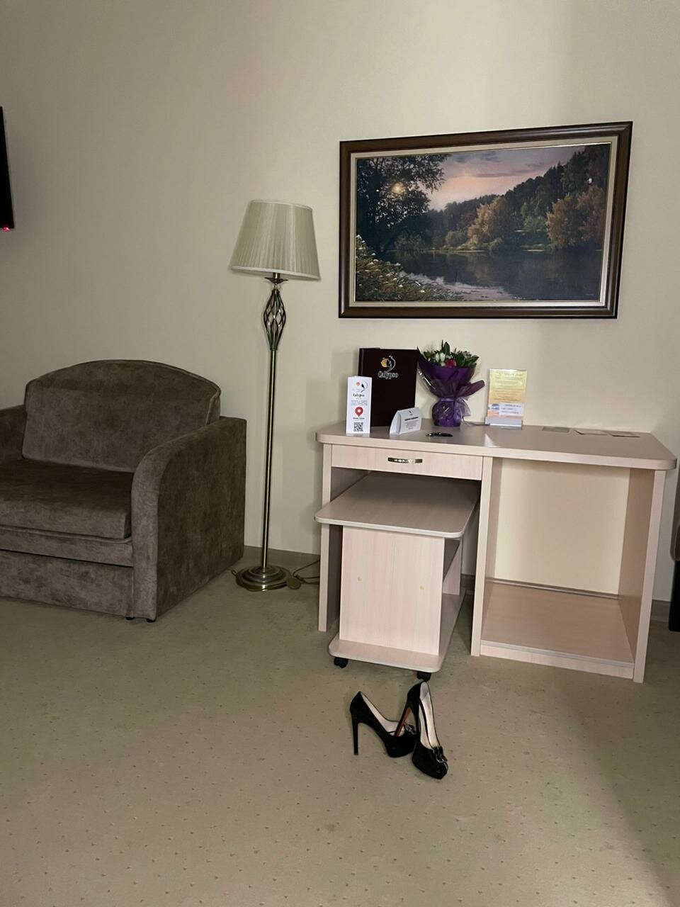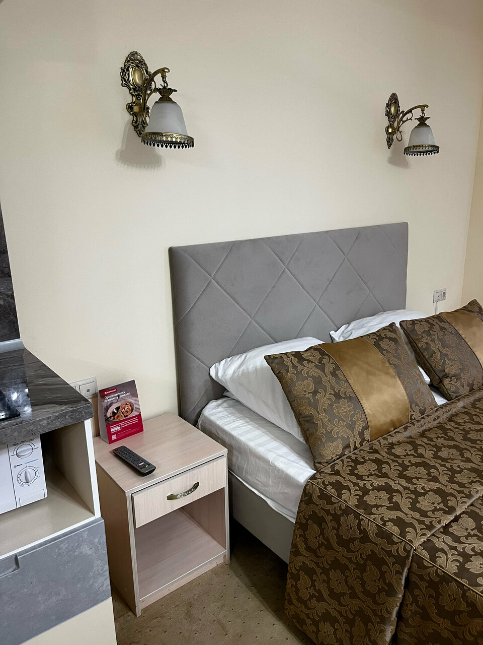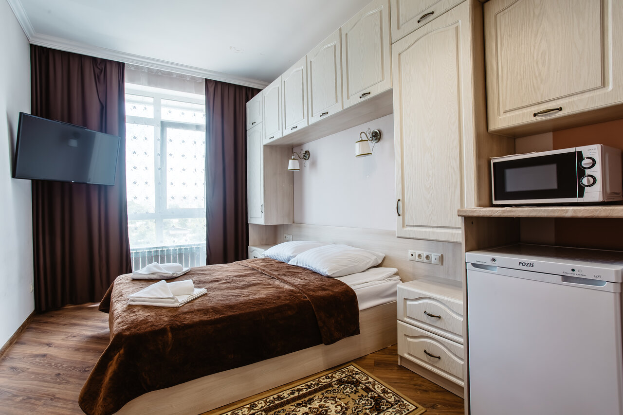- Удобное размещение в номере (большая кровать, холодильник, чайник).