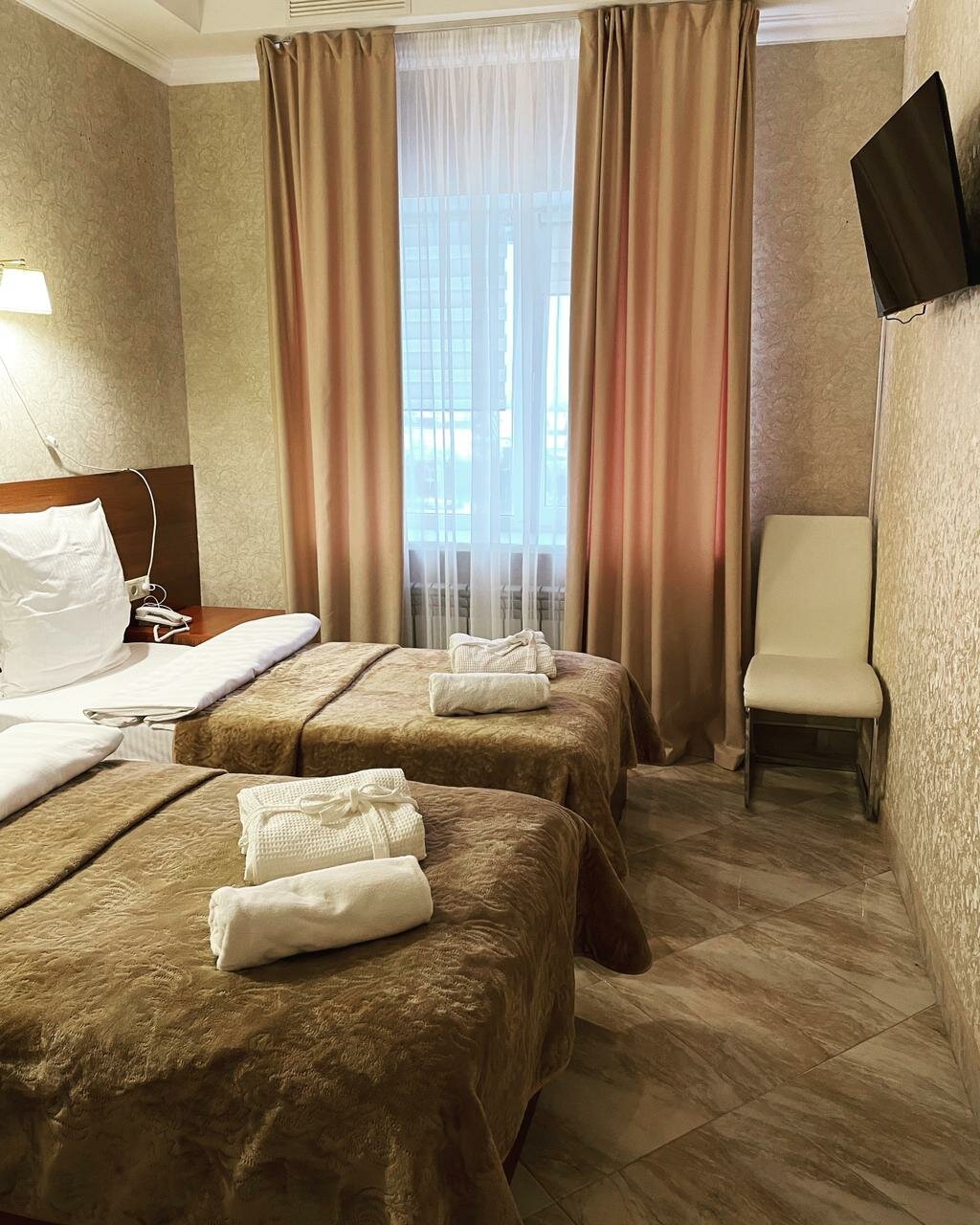 Номер 19 кв м с душем, двумя раздельными кроватями, с возможностью расположиться на доп месте.Завтрак включен в стоимость!В номере холодильник, телевизор, фен, халаты, тапочки, гигиенические наборы.