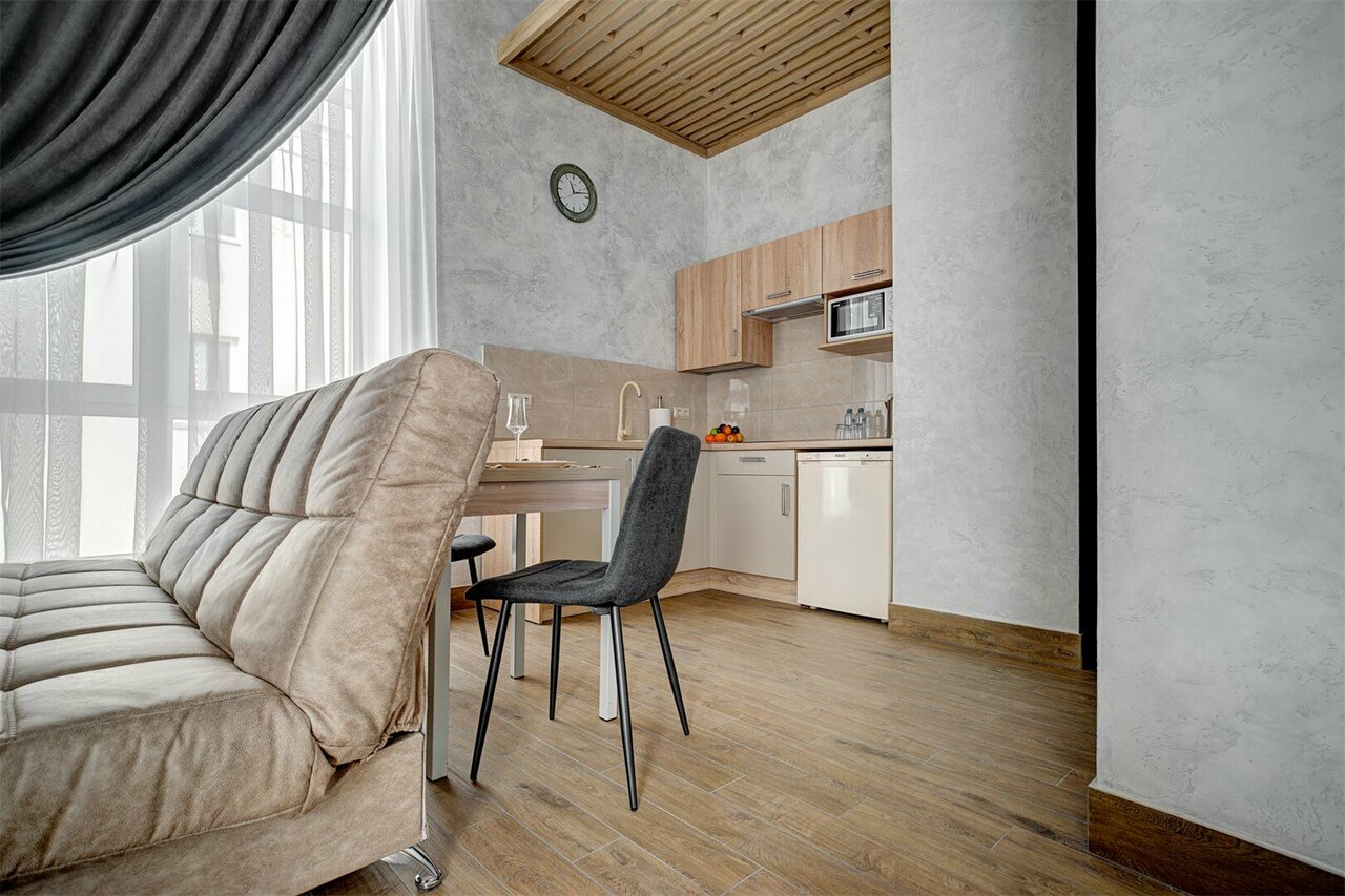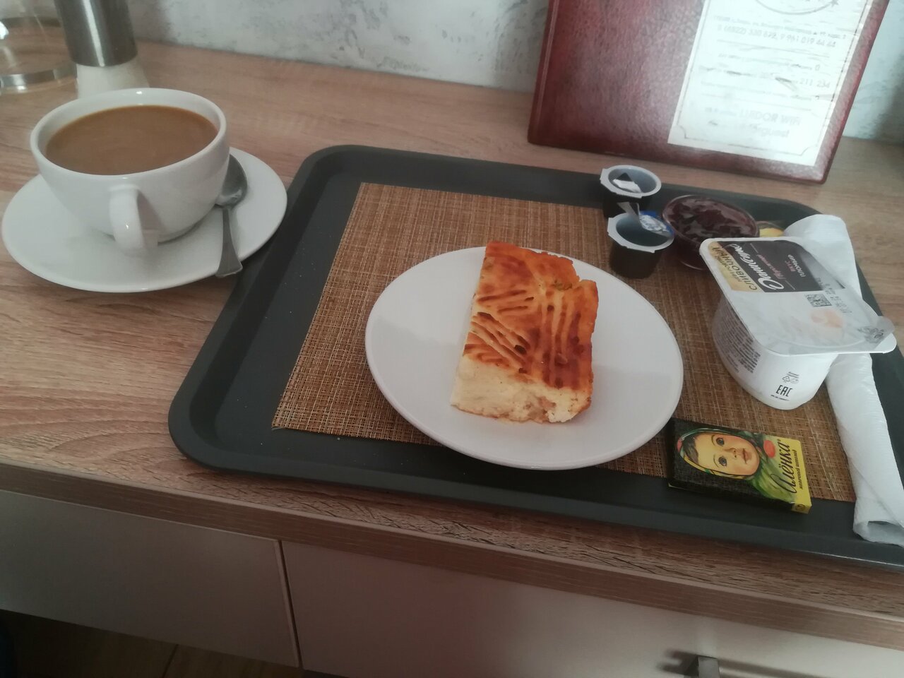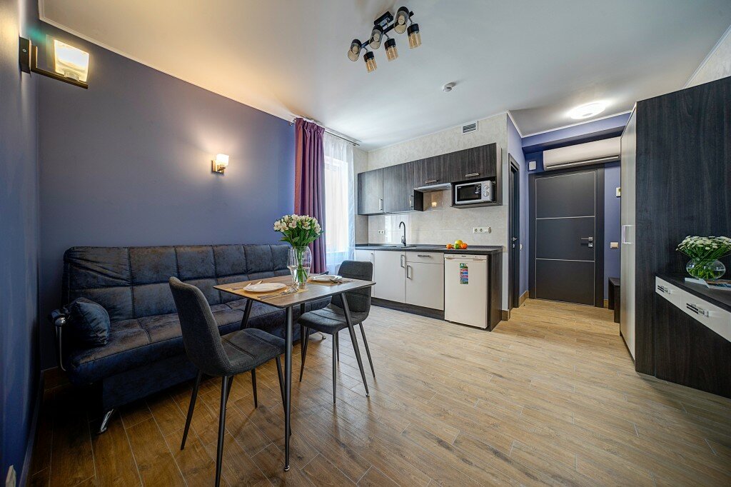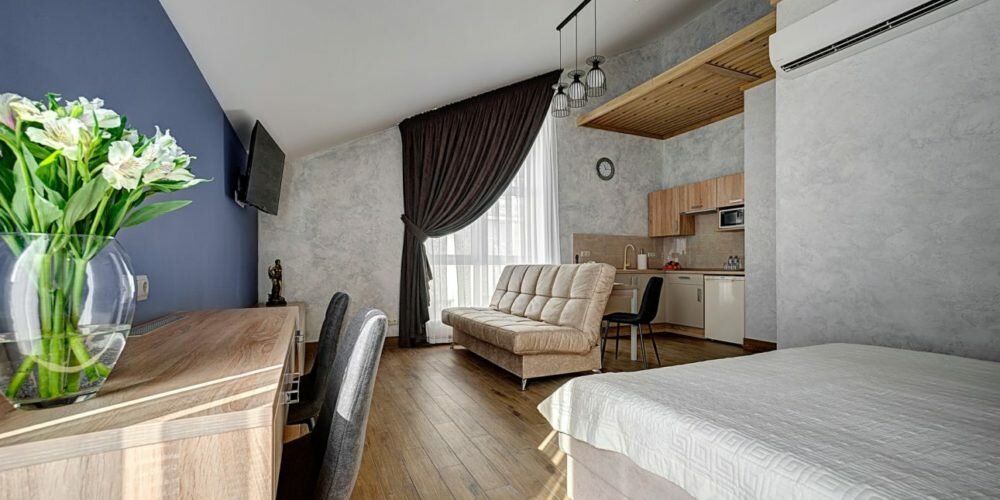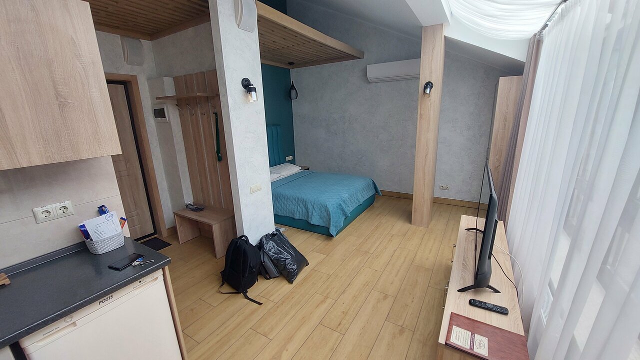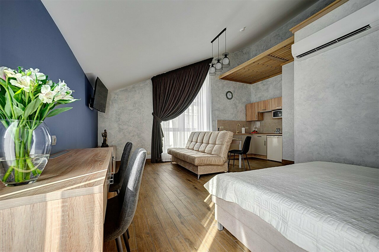 Проживали в студии с балконом на третьем этаже. В номере был кухонный гарнитур (плита, микроволновка, холодильник, наборы посуды; кровать, диван, обеденный стол со стульями и телевизор. В номере есть мини бар: шоколад, энергетик, пиво, чипсы. Звукоизоляции нет от слова совсем. Завтраки, входящие в стоимость проживания : до 9:00 приносят в номер (на выбор: яичница, бутерброд, круассан; кофе/чай) или после 9:00 дают ваучер в ближайшую кафешку (на выбор: каша, сырники, блины, тост, разные виды кофе, чай). Расположение отеля — центральное. Парковка собственная у отеля.