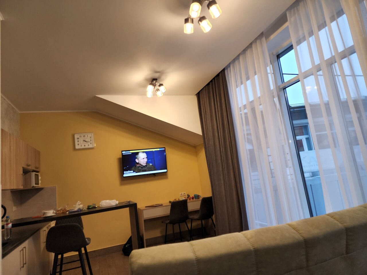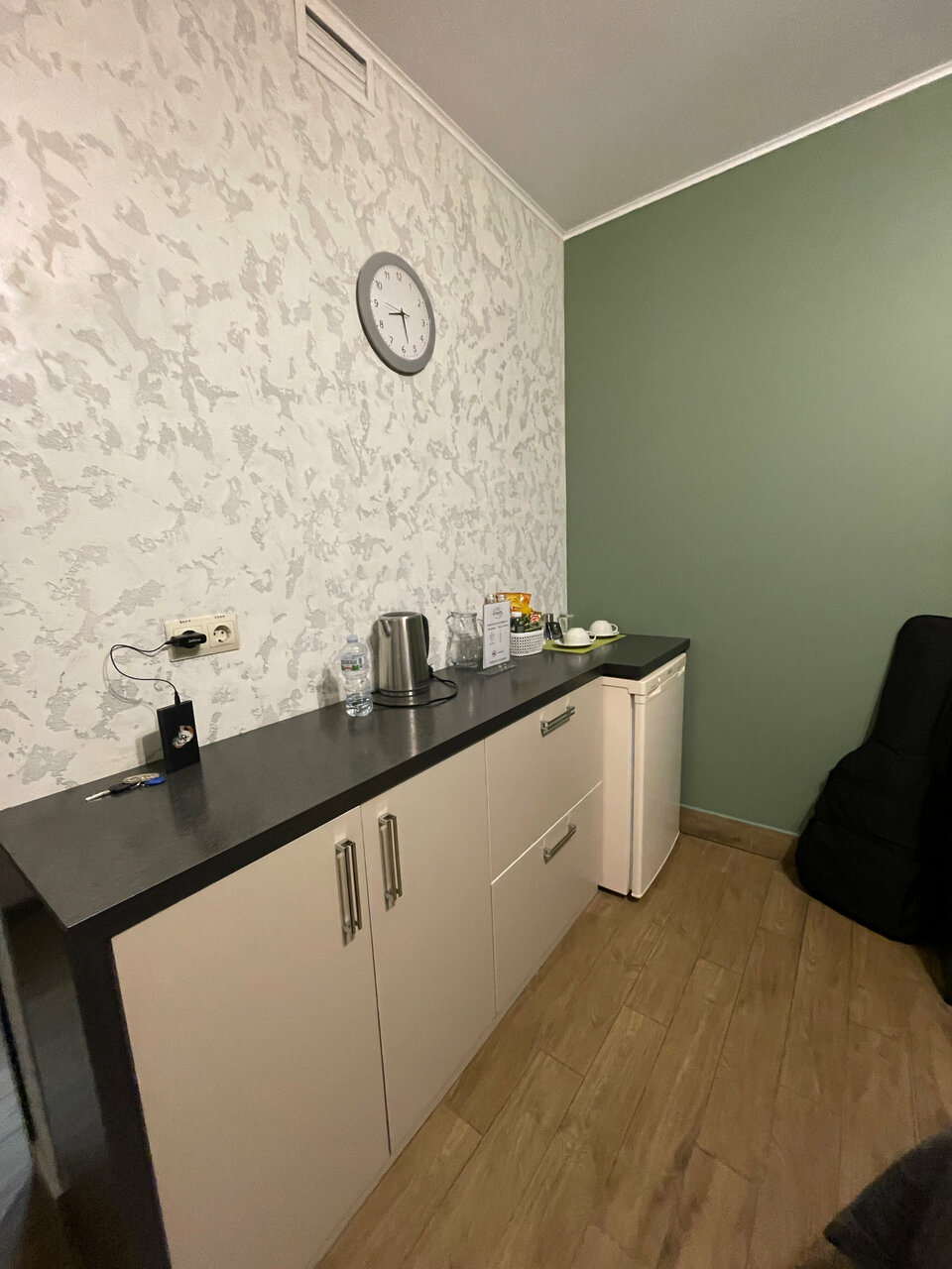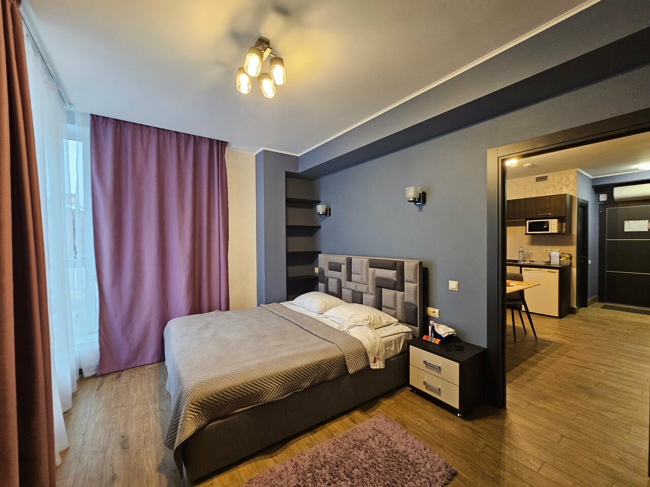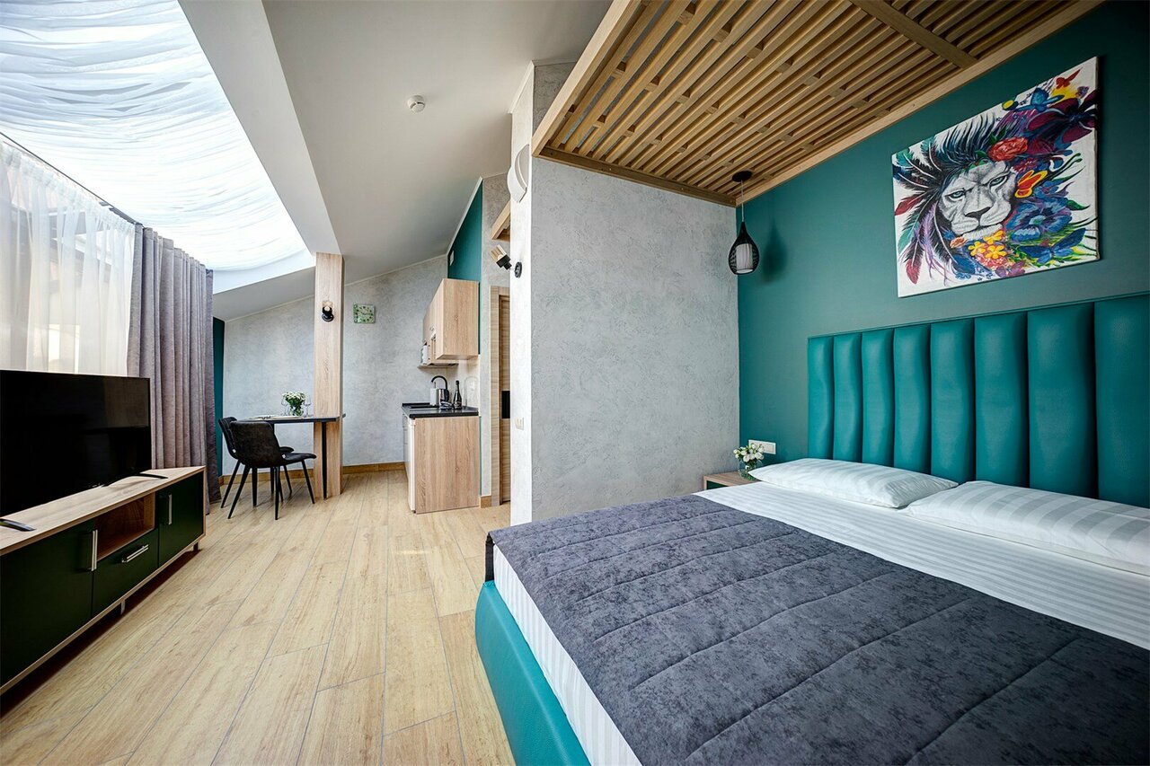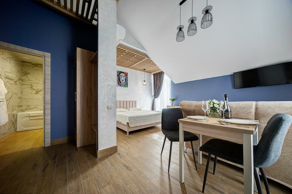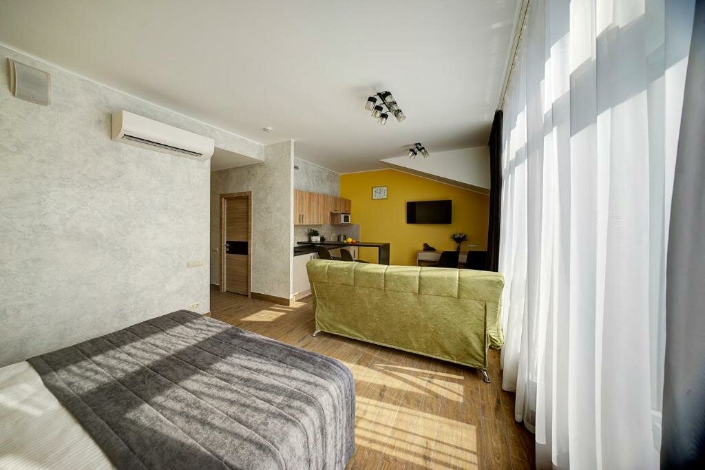Проживали в студии с балконом на третьем этаже. В номере был кухонный гарнитур (плита, микроволновка, холодильник, наборы посуды; кровать, диван, обеденный стол со стульями и телевизор. В номере есть мини бар: шоколад, энергетик, пиво, чипсы. Звукоизоляции нет от слова совсем. Завтраки, входящие в стоимость проживания : до 9:00 приносят в номер (на выбор: яичница, бутерброд, круассан; кофе/чай) или после 9:00 дают ваучер в ближайшую кафешку (на выбор: каша, сырники, блины, тост, разные виды кофе, чай). Расположение отеля — центральное. Парковка собственная у отеля.