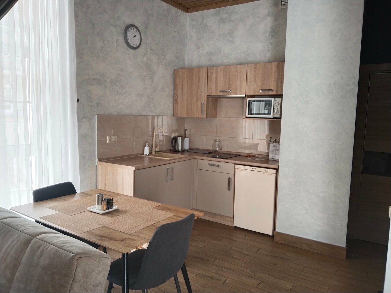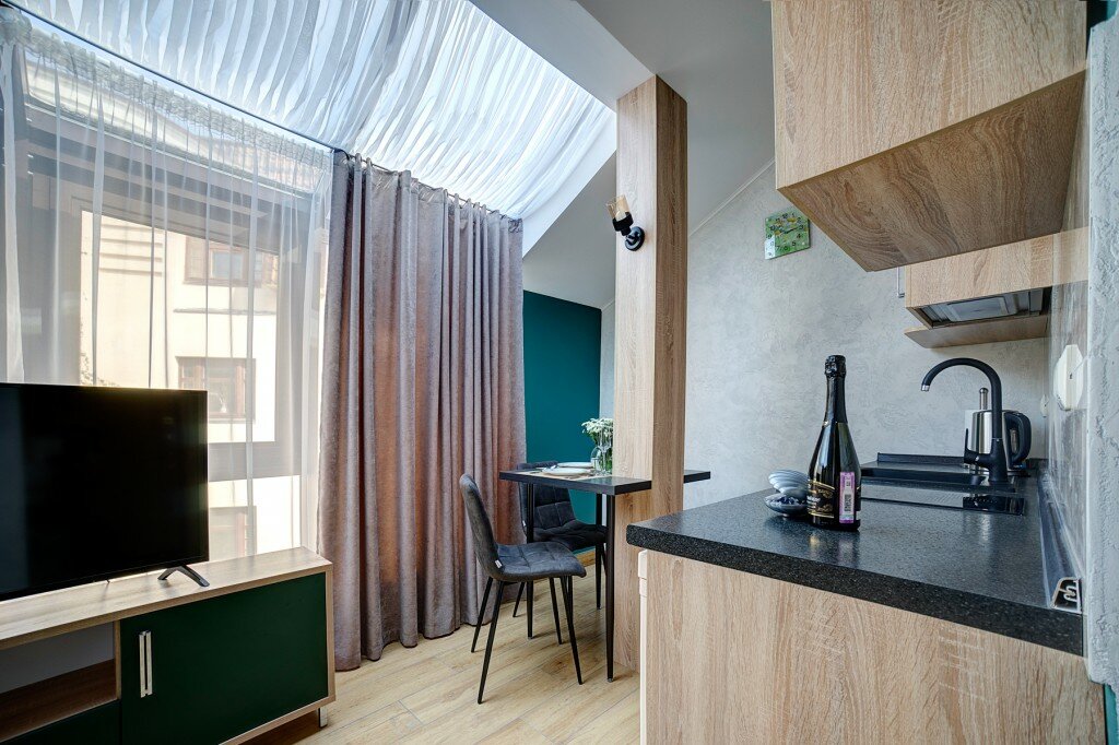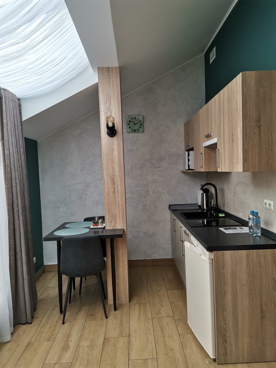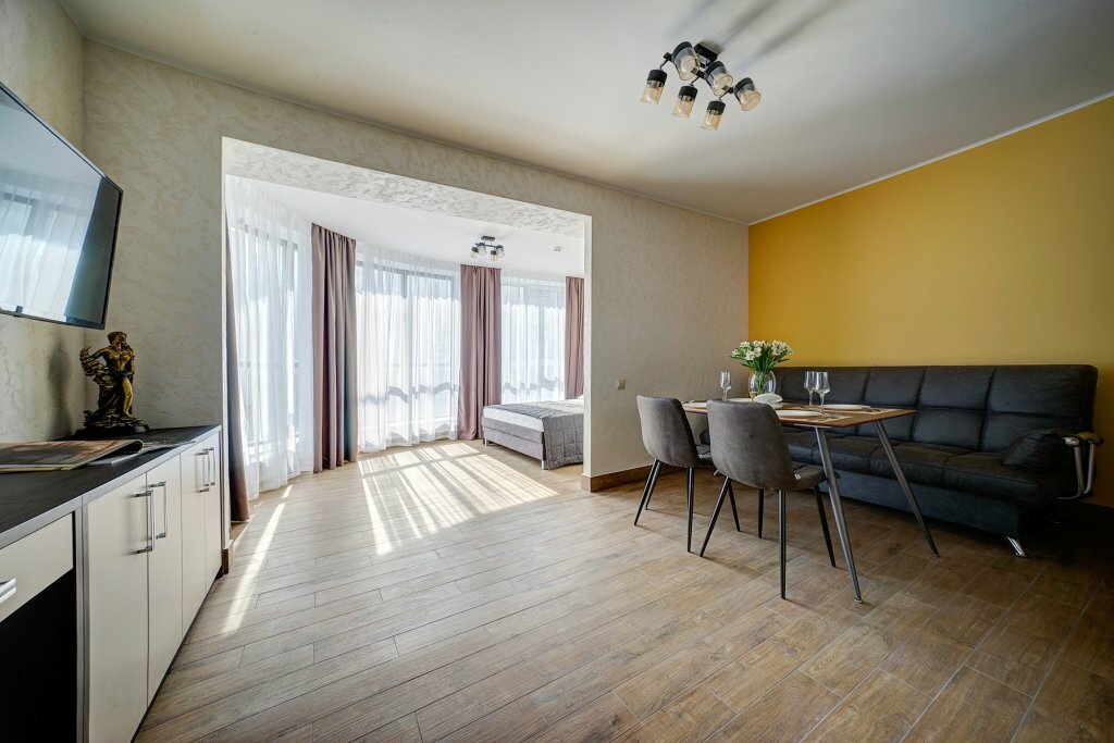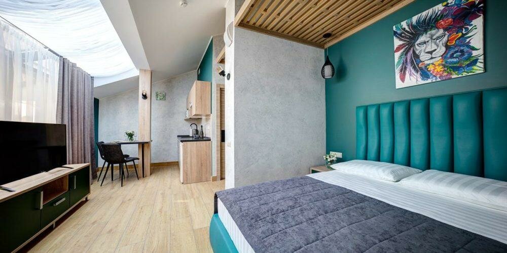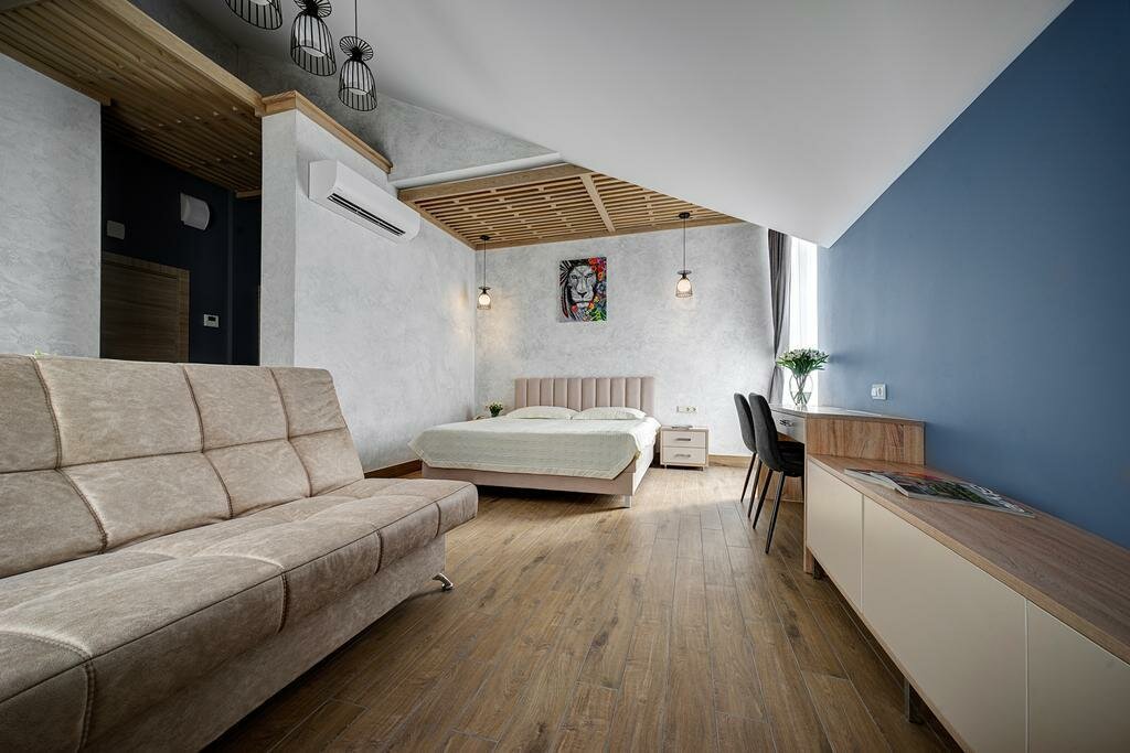 Проживали в студии с балконом на третьем этаже. В номере был кухонный гарнитур (плита, микроволновка, холодильник, наборы посуды; кровать, диван, обеденный стол со стульями и телевизор. В номере есть мини бар: шоколад, энергетик, пиво, чипсы. Звукоизоляции нет от слова совсем. Завтраки, входящие в стоимость проживания : до 9:00 приносят в номер (на выбор: яичница, бутерброд, круассан; кофе/чай) или после 9:00 дают ваучер в ближайшую кафешку (на выбор: каша, сырники, блины, тост, разные виды кофе, чай). Расположение отеля — центральное. Парковка собственная у отеля.
