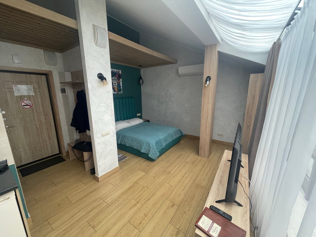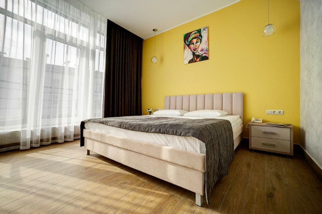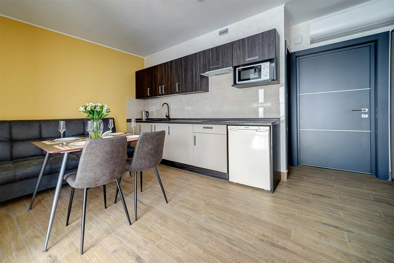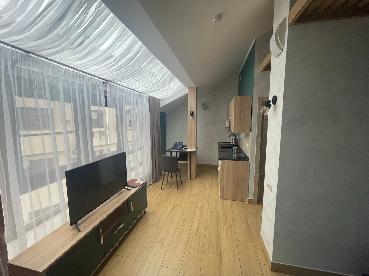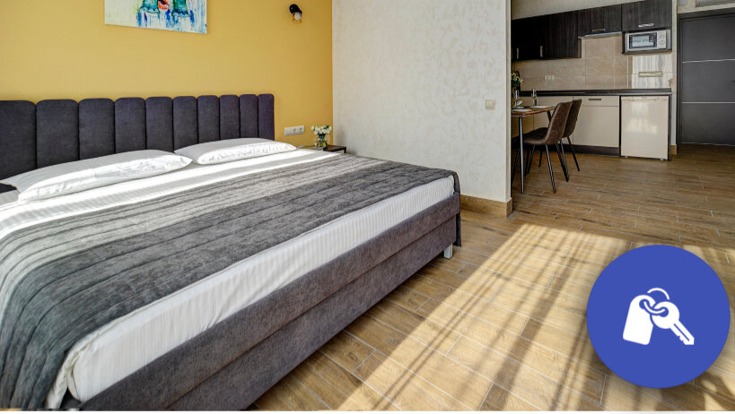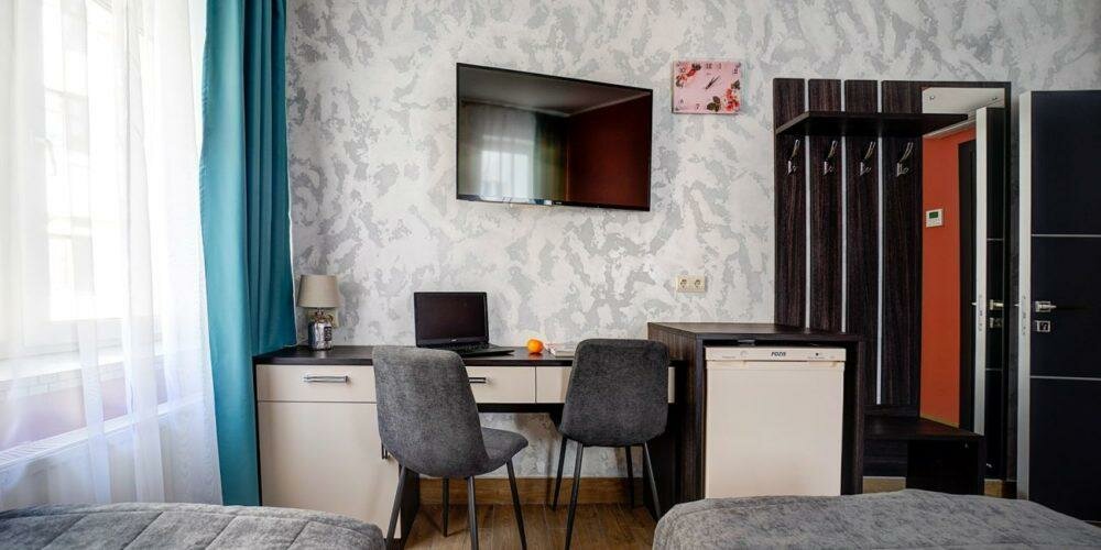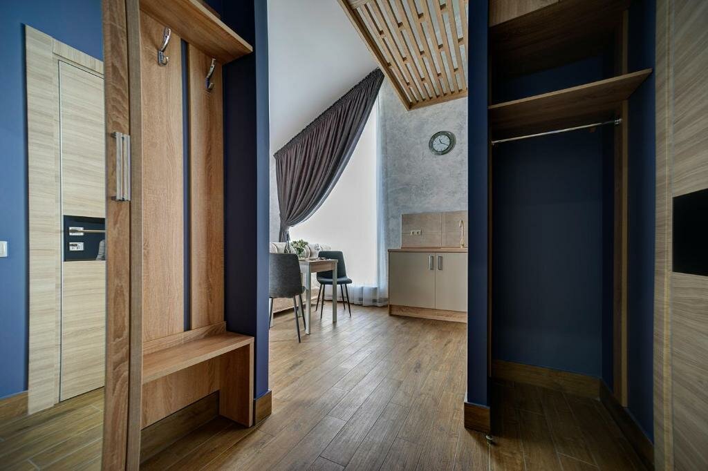 Проживали в студии с балконом на третьем этаже. В номере был кухонный гарнитур (плита, микроволновка, холодильник, наборы посуды; кровать, диван, обеденный стол со стульями и телевизор. В номере есть мини бар: шоколад, энергетик, пиво, чипсы. Звукоизоляции нет от слова совсем. Завтраки, входящие в стоимость проживания : до 9:00 приносят в номер (на выбор: яичница, бутерброд, круассан; кофе/чай) или после 9:00 дают ваучер в ближайшую кафешку (на выбор: каша, сырники, блины, тост, разные виды кофе, чай). Расположение отеля — центральное. Парковка собственная у отеля.