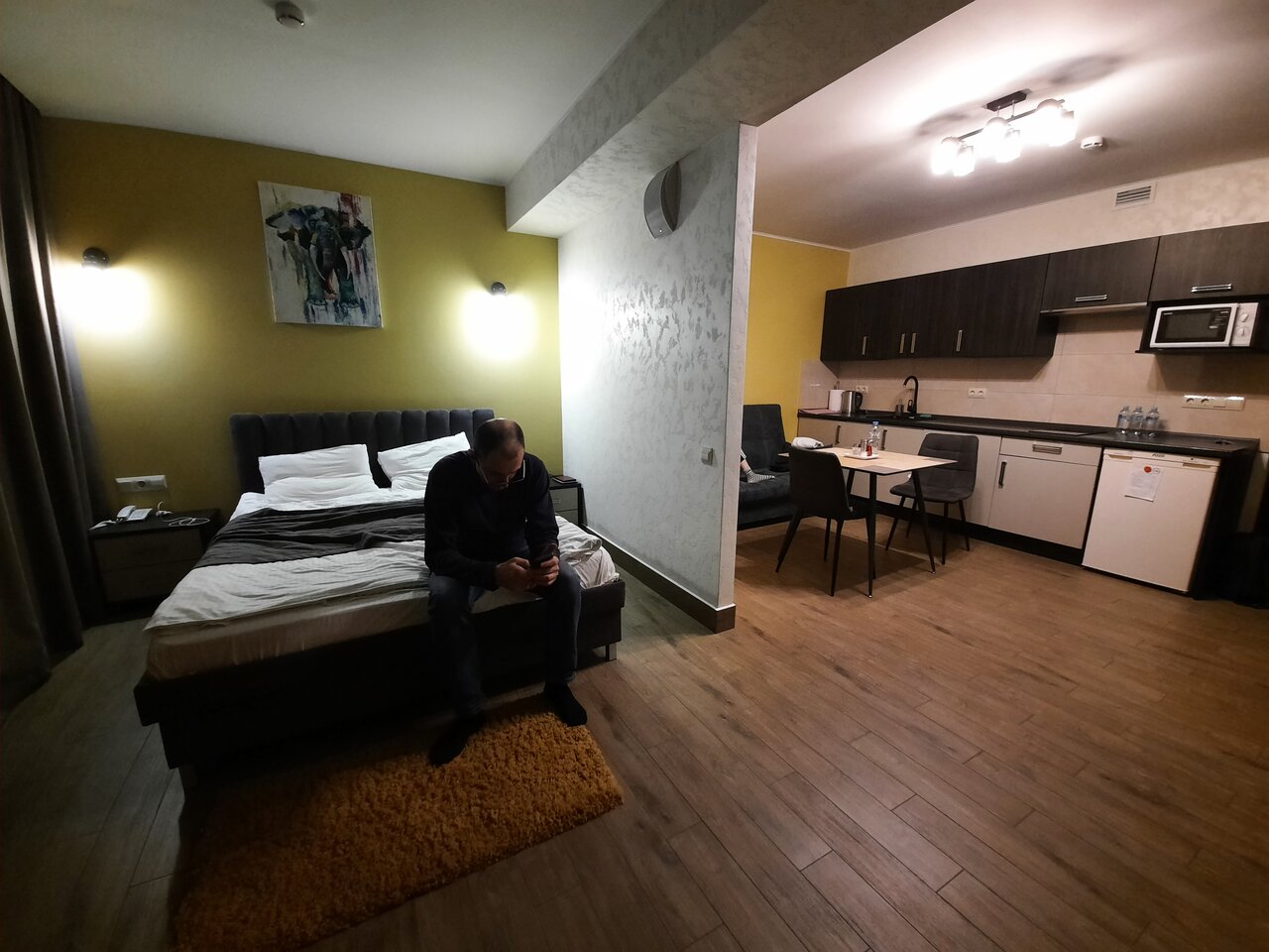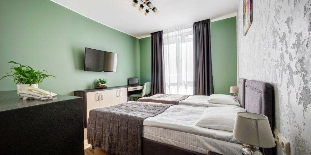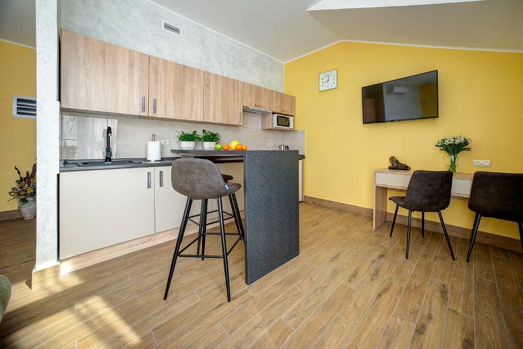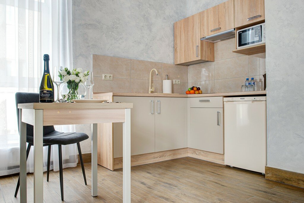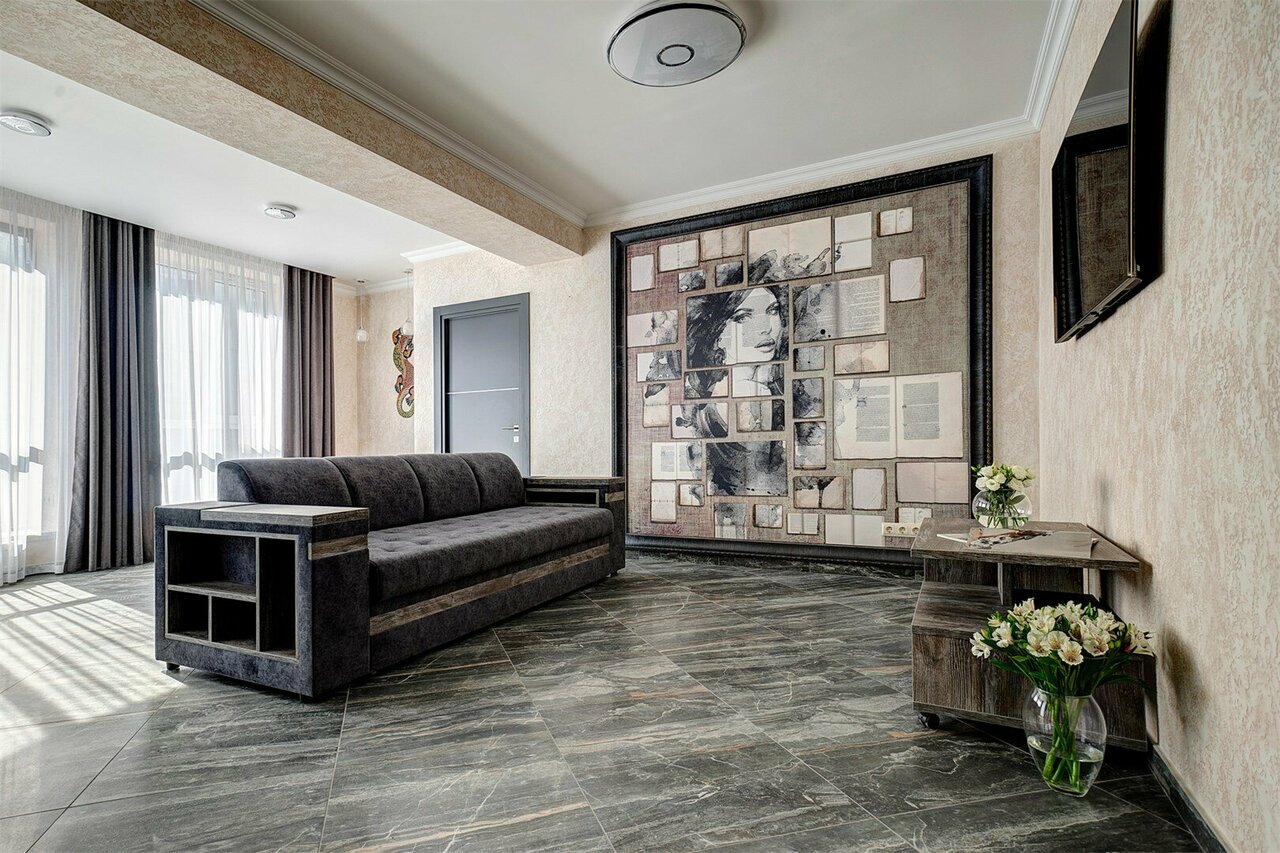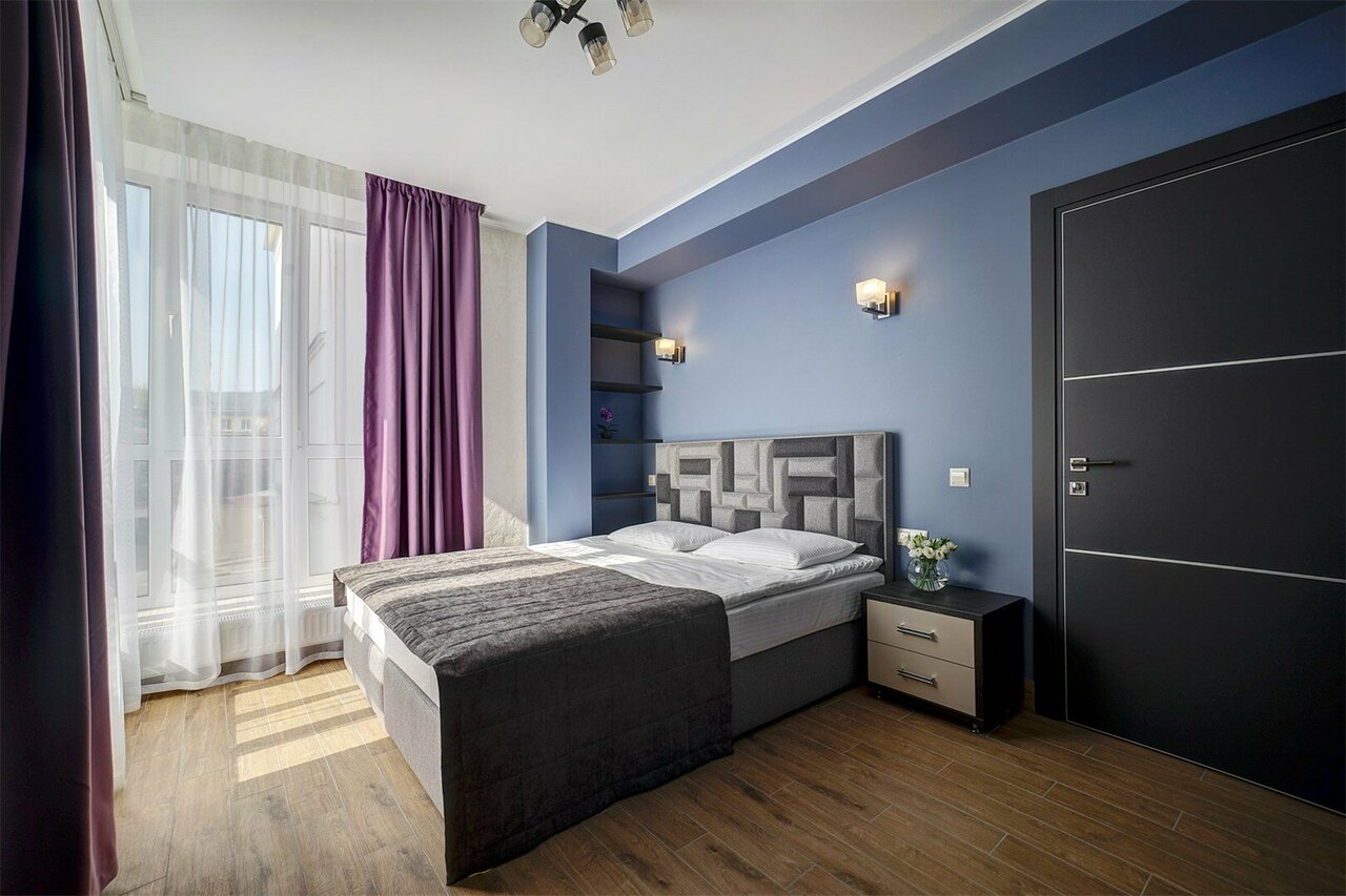 Проживали в студии с балконом на третьем этаже. В номере был кухонный гарнитур (плита, микроволновка, холодильник, наборы посуды; кровать, диван, обеденный стол со стульями и телевизор. В номере есть мини бар: шоколад, энергетик, пиво, чипсы. Звукоизоляции нет от слова совсем. Завтраки, входящие в стоимость проживания : до 9:00 приносят в номер (на выбор: яичница, бутерброд, круассан; кофе/чай) или после 9:00 дают ваучер в ближайшую кафешку (на выбор: каша, сырники, блины, тост, разные виды кофе, чай). Расположение отеля — центральное. Парковка собственная у отеля.