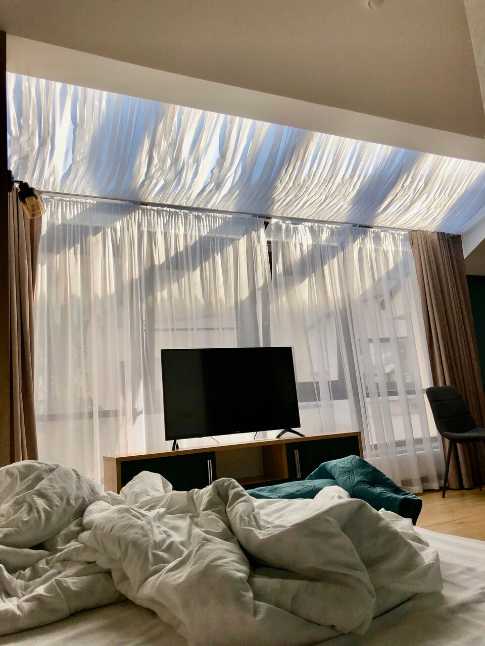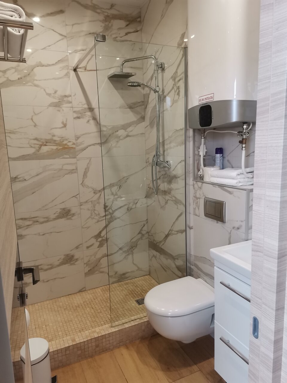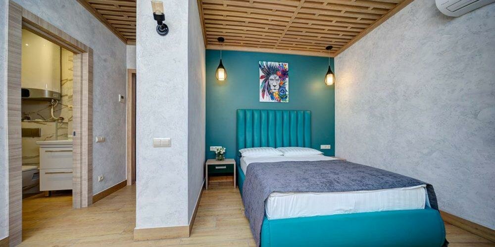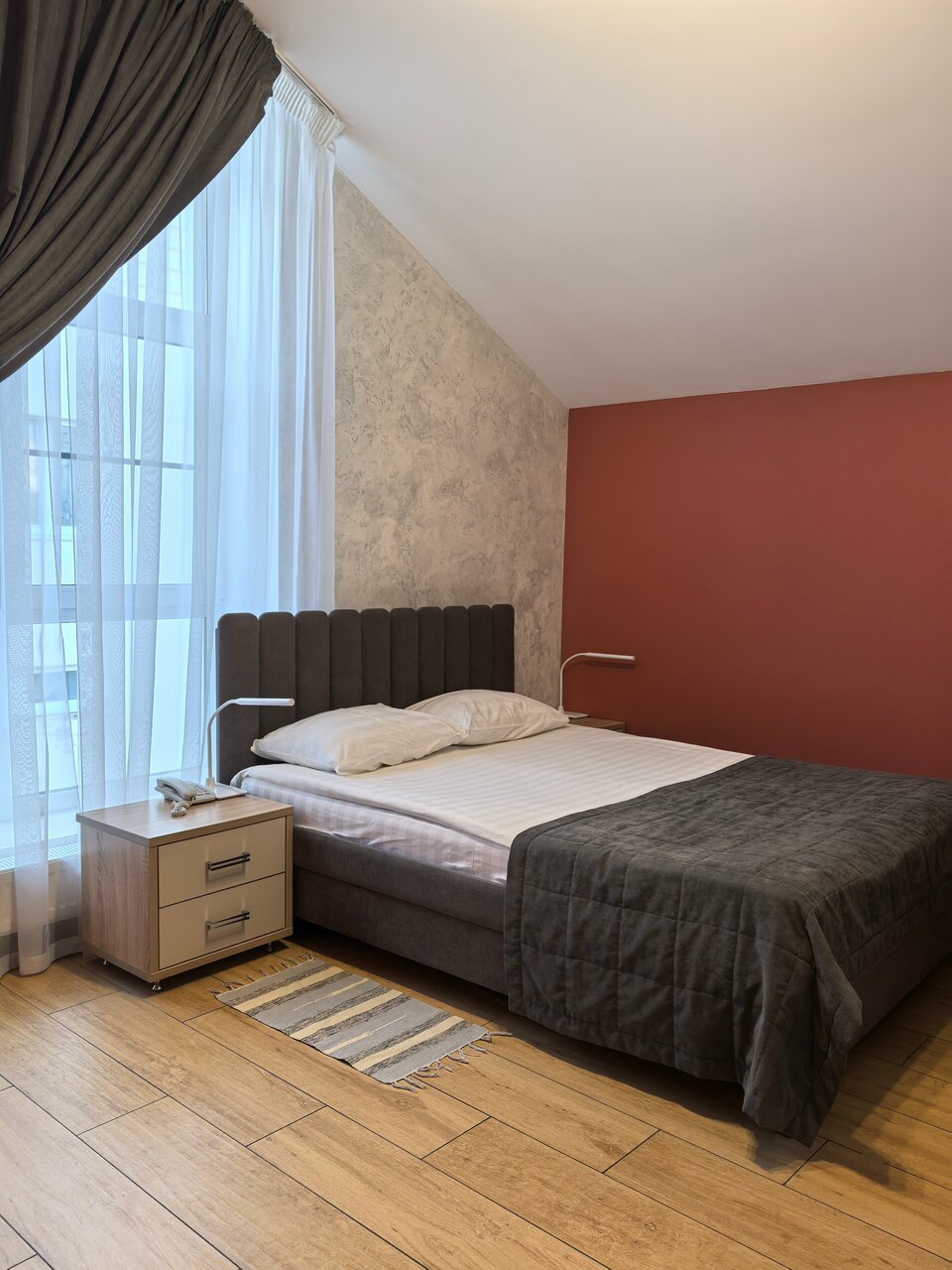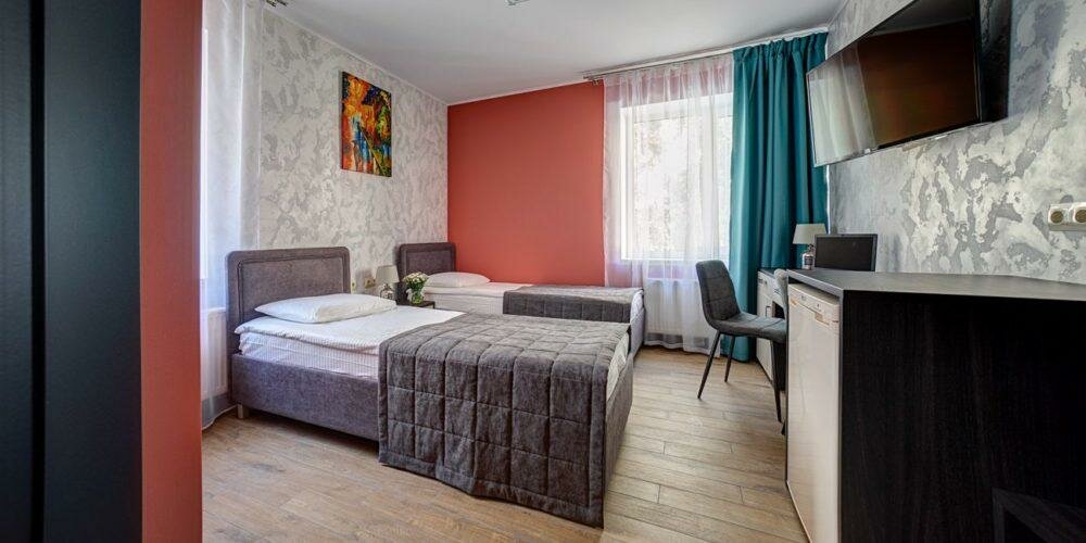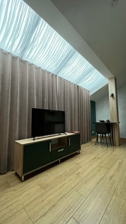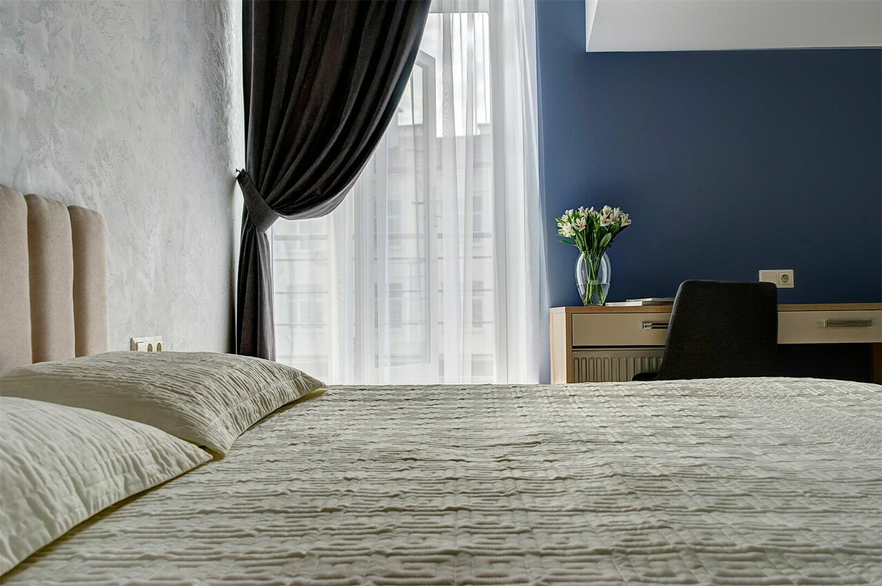 Проживали в студии с балконом на третьем этаже. В номере был кухонный гарнитур (плита, микроволновка, холодильник, наборы посуды; кровать, диван, обеденный стол со стульями и телевизор. В номере есть мини бар: шоколад, энергетик, пиво, чипсы. Звукоизоляции нет от слова совсем. Завтраки, входящие в стоимость проживания : до 9:00 приносят в номер (на выбор: яичница, бутерброд, круассан; кофе/чай) или после 9:00 дают ваучер в ближайшую кафешку (на выбор: каша, сырники, блины, тост, разные виды кофе, чай). Расположение отеля — центральное. Парковка собственная у отеля.