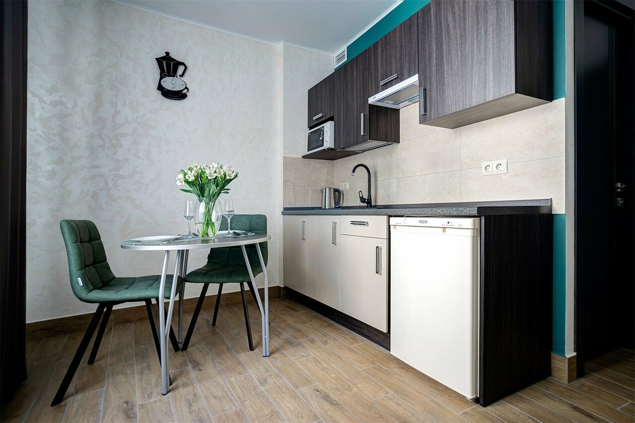 - Современный ремонт и новая мебель.; Возможность проживания с животными (выдают миски, лежанку).; Вежливый и приветливый персонал.; Наличие номеров с кухней и необходимой техникой.; Мини-бар в номере.