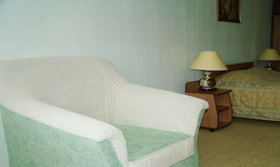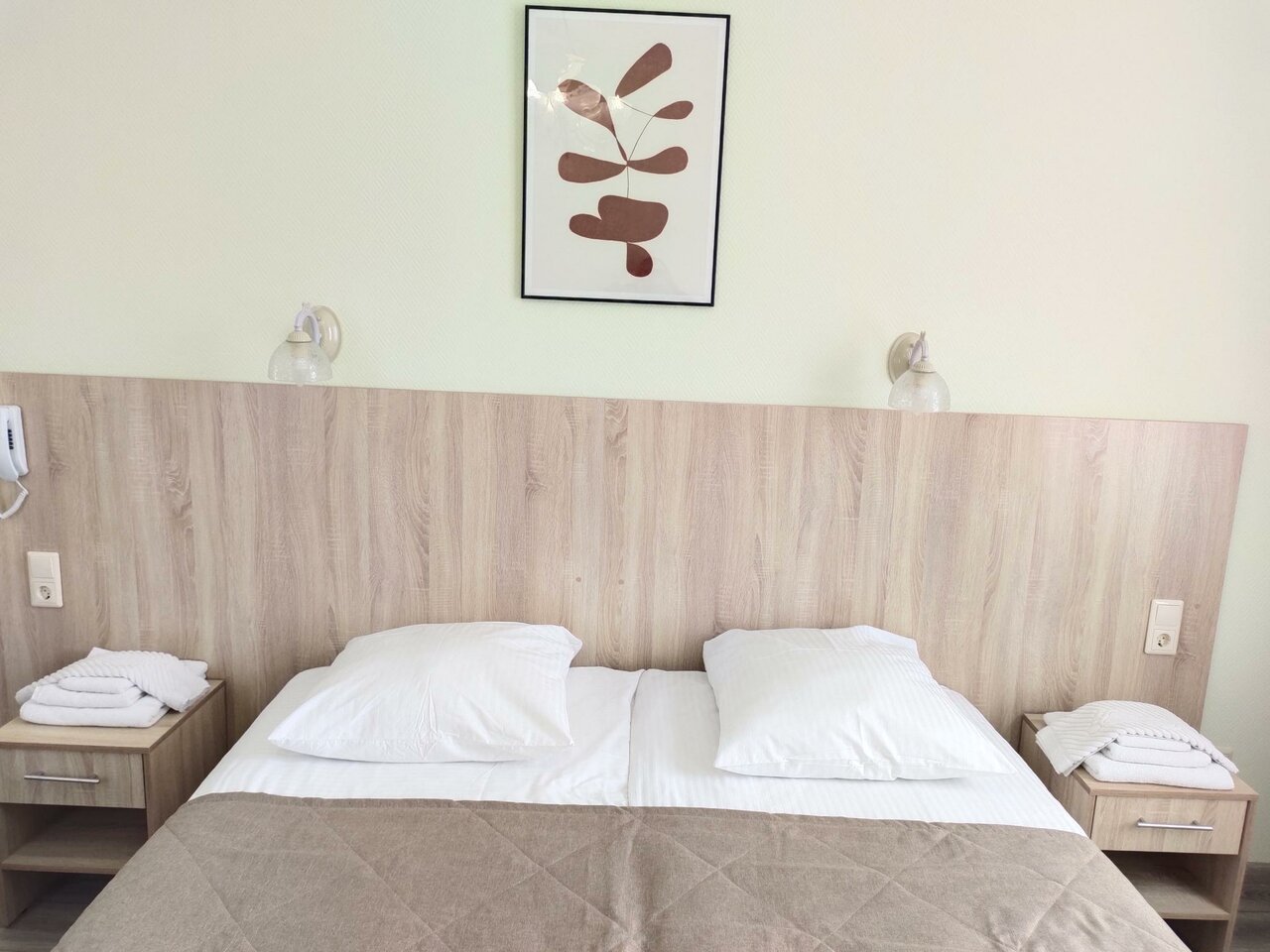 номер'Стандарт' с двухспальной кроватью и доп. местом(тахта),в номере есть санузел(унитаз,душ),телевизор,холодильник,чайный столик. Ребенок до 5 лет размещается бесплатно без предоставления места.