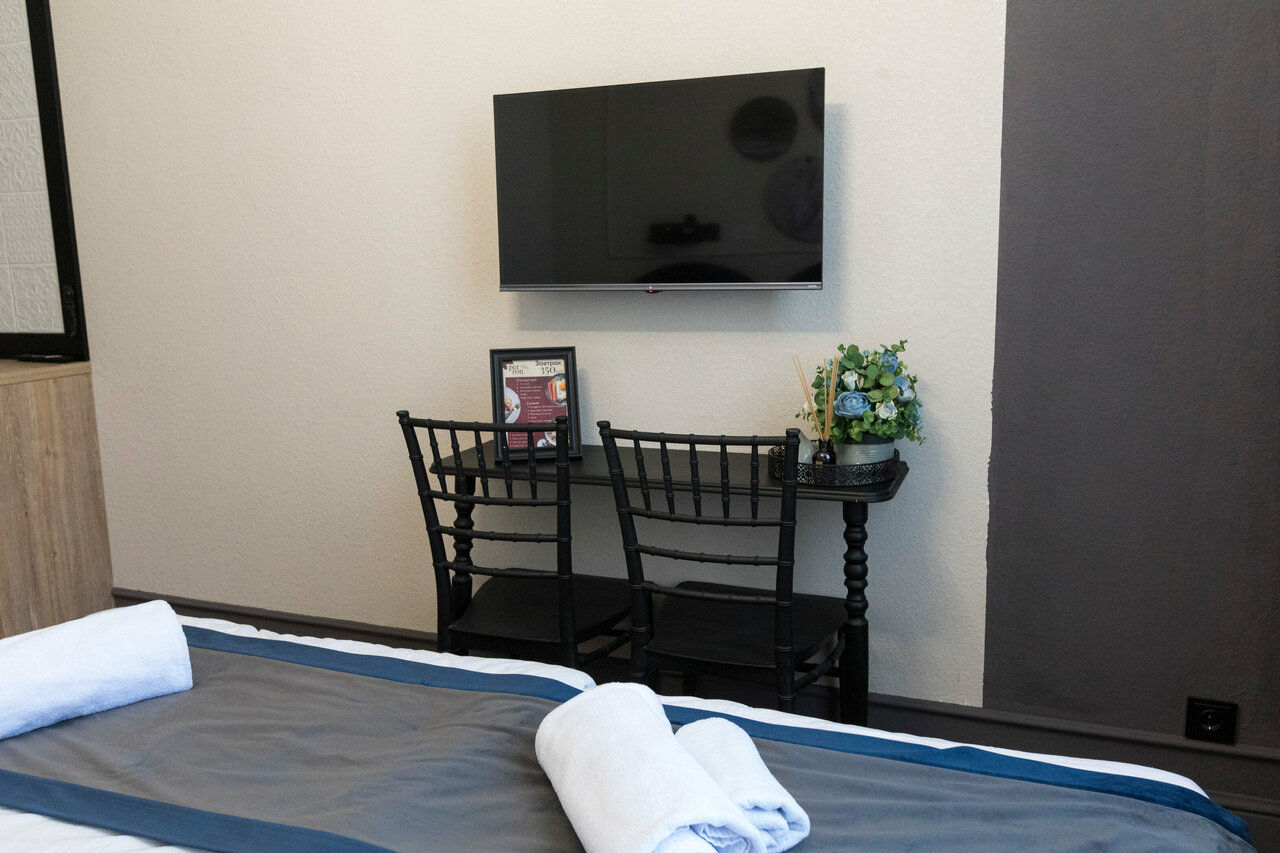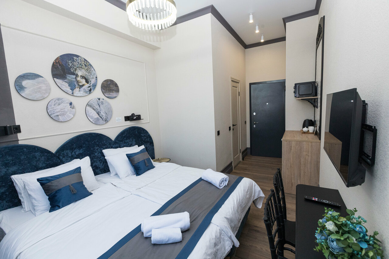 Номер выполнен в современной интерпретации русского стиля. В нем вы найдете все необходимое для комфортного проживания: Мини-кухня Личная ванная комната, Smart TV, бесплатный WI-FI, утюг и гладильная доска. Несколько сортов чая и кофе