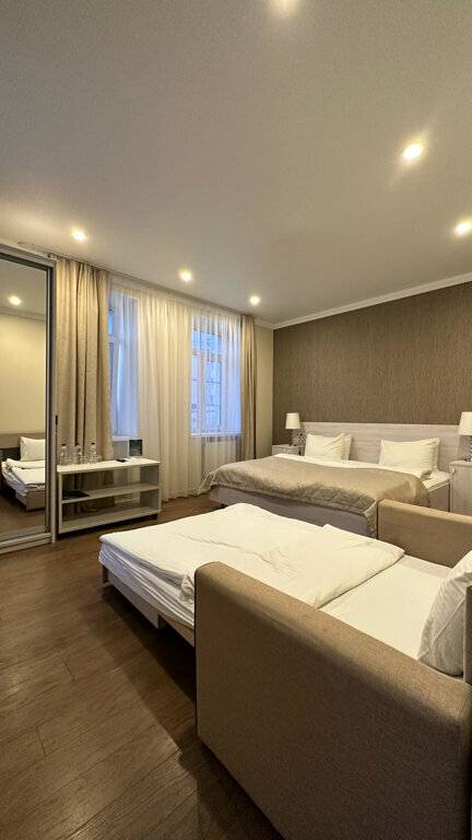 Большие апартаменты с мини-кухней. Этот номер отличается своей освещённостью, ведь в нем 5 больших окон с видом на одну из главных улиц города. Такой номер идеально подойдет для спокойного и тихого отдыха. Возможно предоставления до 2-х дополнител...