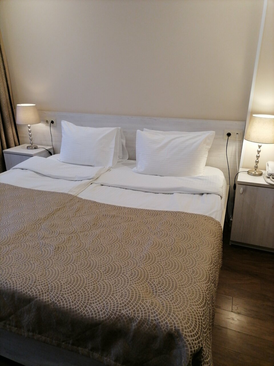 Были в июне 2024. Центр города, все достопримечательности в пешей доступности, удобно! Хорошие завтраки, если на два-три дня, то ок, если дольше, то надоест, т. к. каждый день одно и то же. Соседей не слышали, не знаю, может шумоизоляция есть или они все время спали). Номер был очень маленький, сан узел два на метр, не повернуться, раковина это просто… маленькая и низкая, умывались в душевой кабине. Но больше всего удивляют отзывы, что очень удобные кровати и матрасы. Да, кровать большая, но матрас очень мягкий, спишь, как в гамаке. Ладно я 90 кг, но жена 55, тоже провалилась, в общем, спали в глубокой амплитуде. Ну и конечно шум, но тут нужно понимать, что это центр, машины, рядом дорога, музыка и днем чайки))). На самом деле терпимо, тем более три звезды, но я бы туда ещё поехал при условии, если поменяют матрасы. Ещё к плюсам, есть парковка. Всем хорошего отдыха!