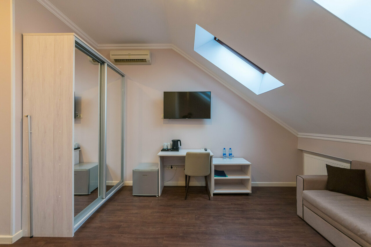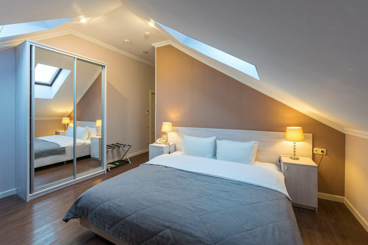 Это комфортабельные номера с мансардой или без нее. В номере 2 односпальные или 1 двуспальная кровать. Возможно предоставление дополнительного спального места. Номера могут отличаться от представленных на фото.