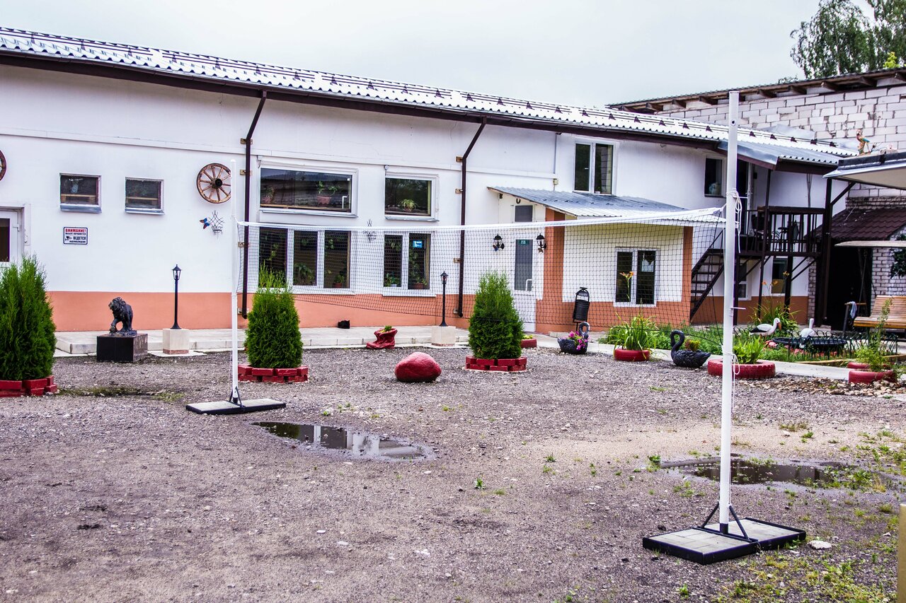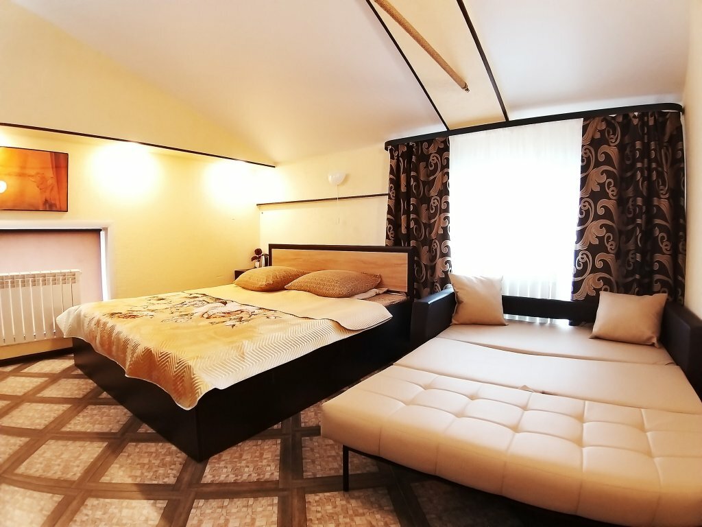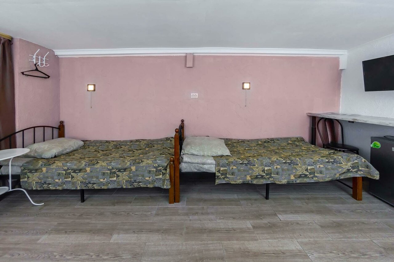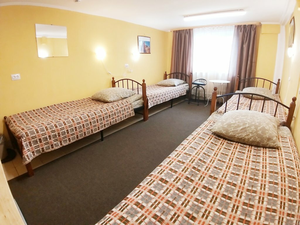 Очень низкий потолок, мебель старая, освещение в номере низкое. На 4 человека (2 взрослых и 2 ребёнка) номер обошёлся в 3600,но это был хостел низкого качества с удобствами на этаже. Полотенца и туалетную бумагу пришлось просить. Из плюсов — было отопление в мае, в холодную ночь. Было тихо. Своя парковка. Максимум подходит на одну ночь.