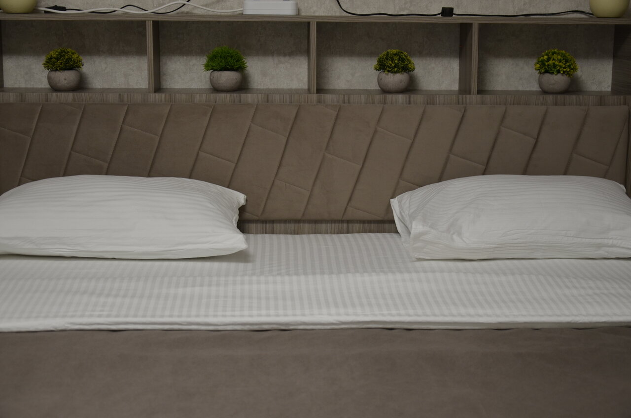 Снимали апартаменты. Хорошо оборудованные, матрац на кровати отличный. Можно готовить еду ,есть стиральная машина.