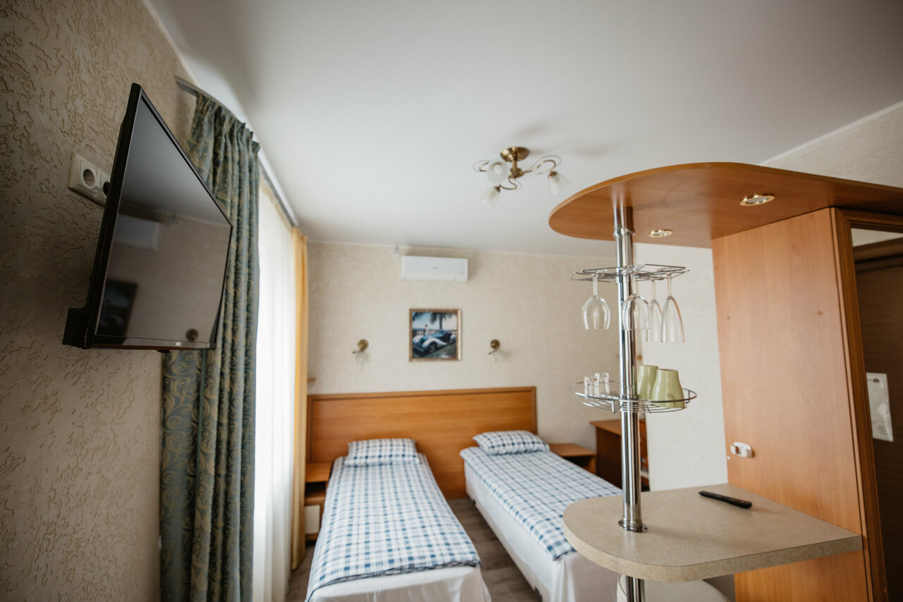 Засели на третий этаж, номер маленький, не развернуться, просили двухспальную кровать, собрали из двух матрасов, которые постоянно разъезжались. Отель в частном секторе рядом простые дачные дома.