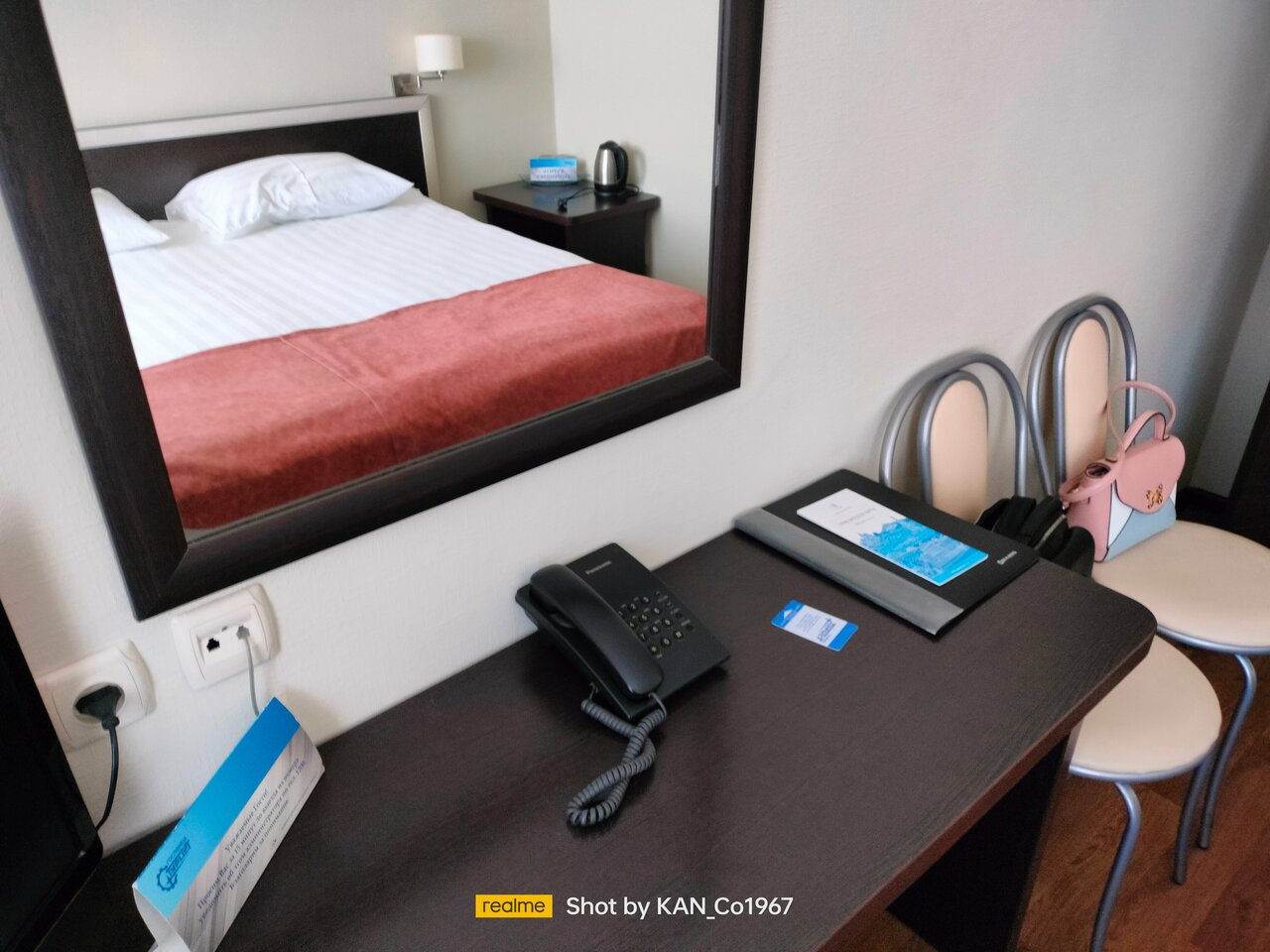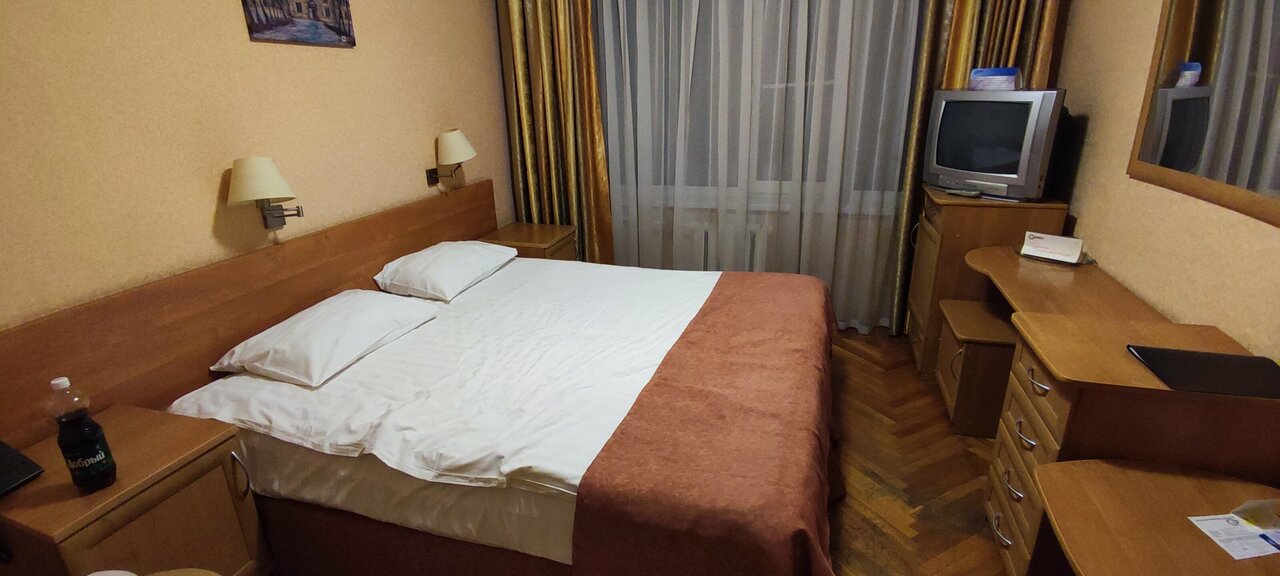 Отель из ,,Советского прошлого,, (что не очень плохо) ! Администратор довольно вежливая и приветливая дама.В номерах приличного качества постельное бельё и слегка застиранные полотенца)) ,паркет от СССР! В целом номера неплохие!Чисто,но требуют капремонта))) На цокольном этаже есть кафе.Можно поесть, если не сильно гурман в еде))) Общее впечатление за одноместный номер стоимостью 2600 в сутки — немного превышена цена! Но,остановится на ночь вполне можно.