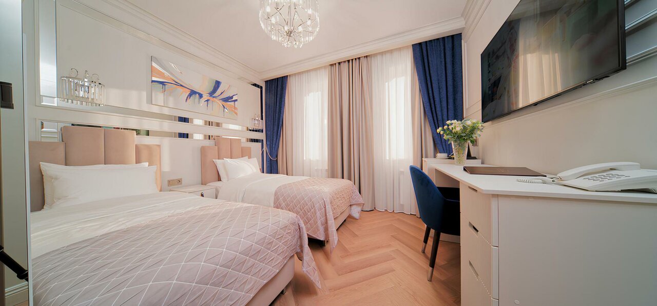 Роскошные и просторные номера выполнены с элементами декора в трех разных цветовых гаммах — Аметист, Сапфир и Рубин.
