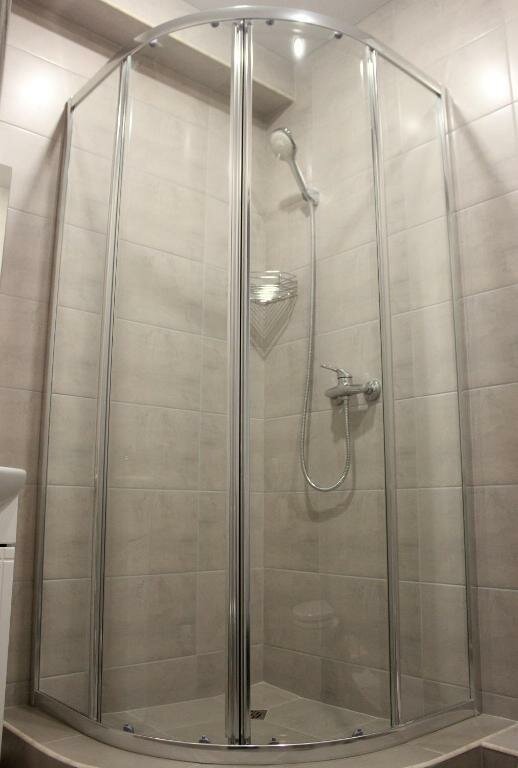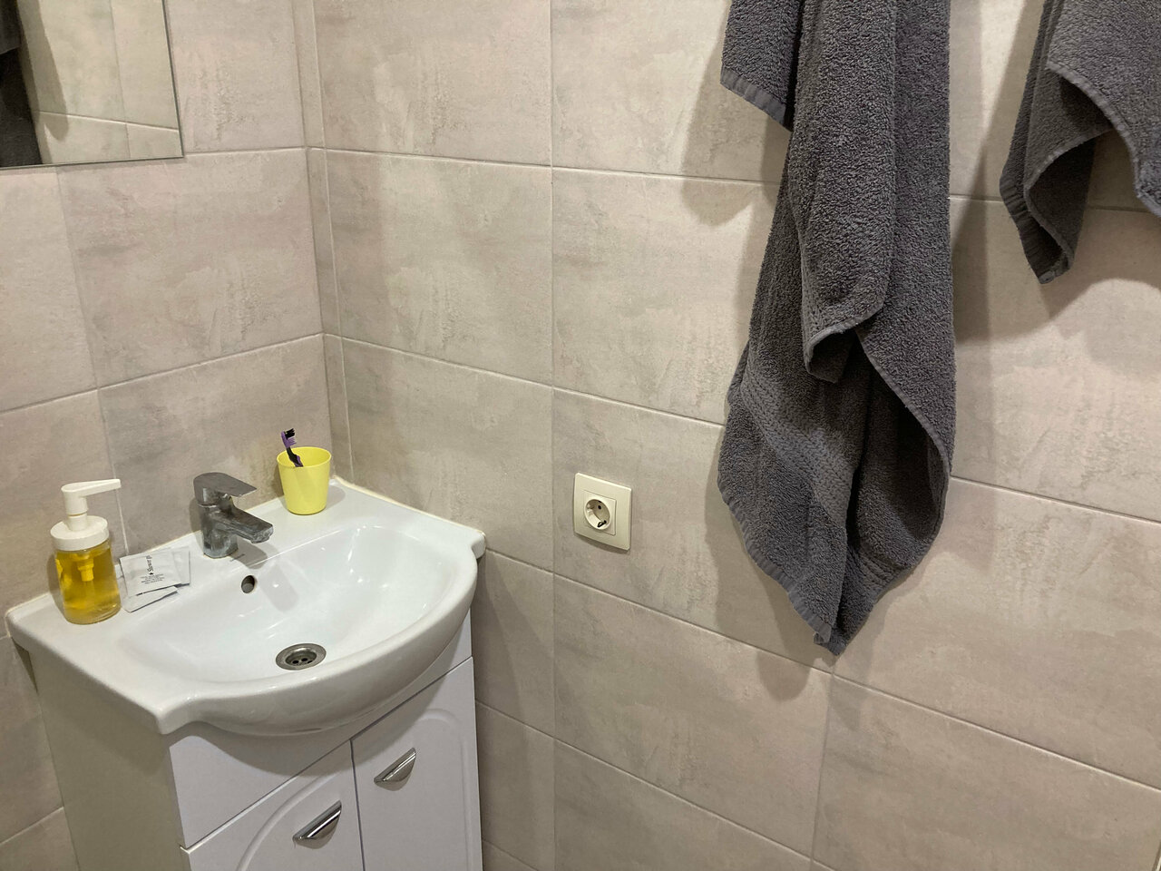 - В ванной только жидкое мыло, нет стакана и полки.