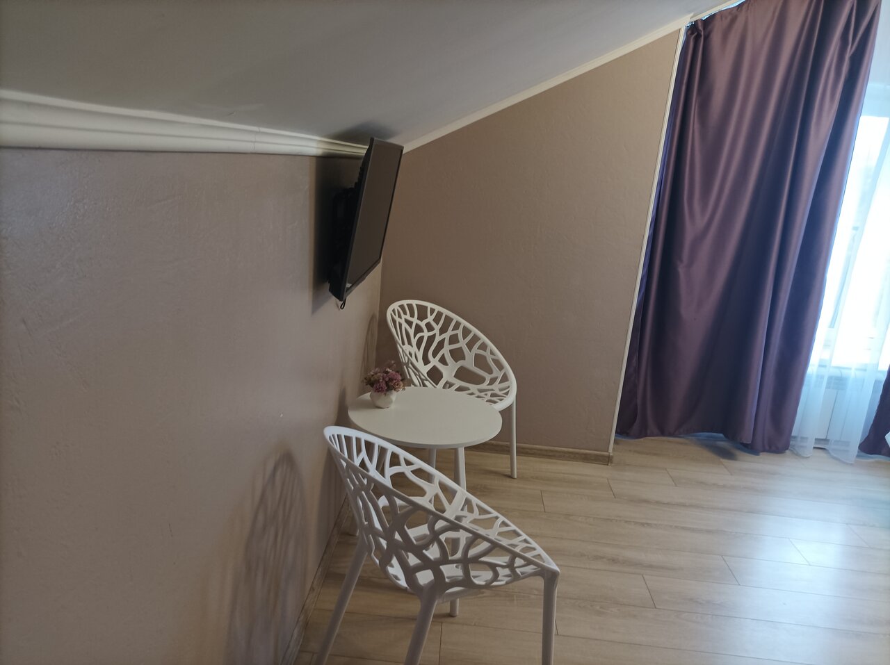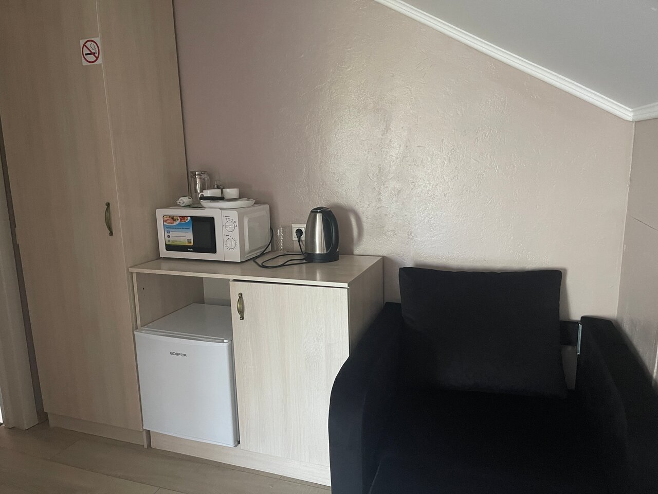 Грязно. Неухоженный номер, неприятно находиться. Все липкое, слои пыли, в холодильнике плесень. Матрас на односпальной кровати проваливался. В номере курили, был запах. Отель прямо на проезжей части, шум как на взлетной полосе. В ванной нет крючков, шампуней, гелей, мыла,полотенца для ног. Когда-то отель был неплох, номер изначально красивый, но все пришло в запустение и неухоженность.