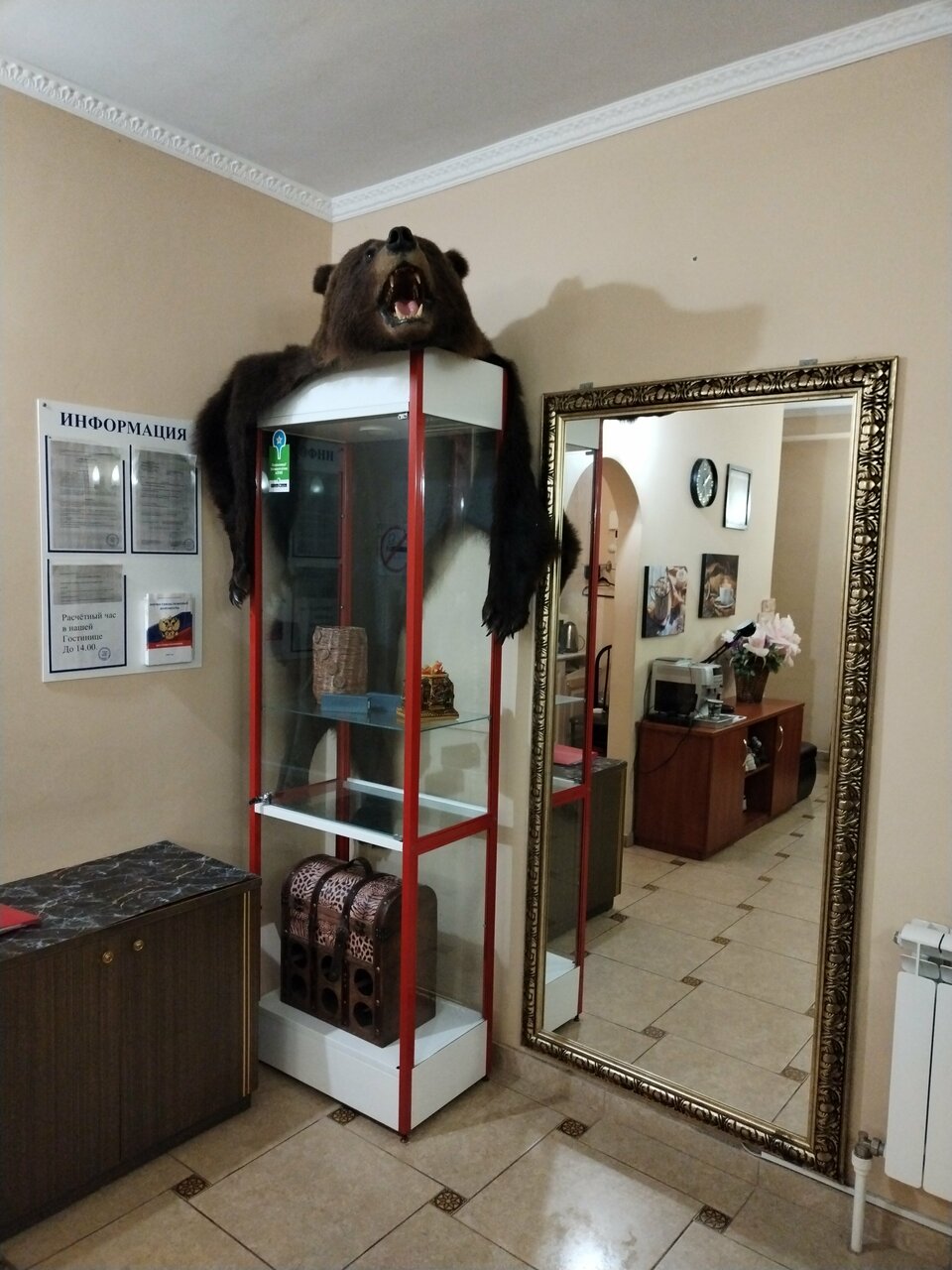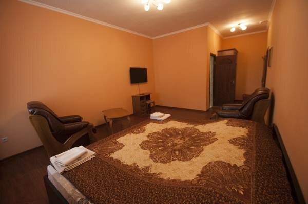 Номер был просторный. Персонал добрый. Телевизор без андроид тв. Вайфай не предложили. Розетки размещены не удобно. Подъезд к зданию никакой, весь раздолбан.