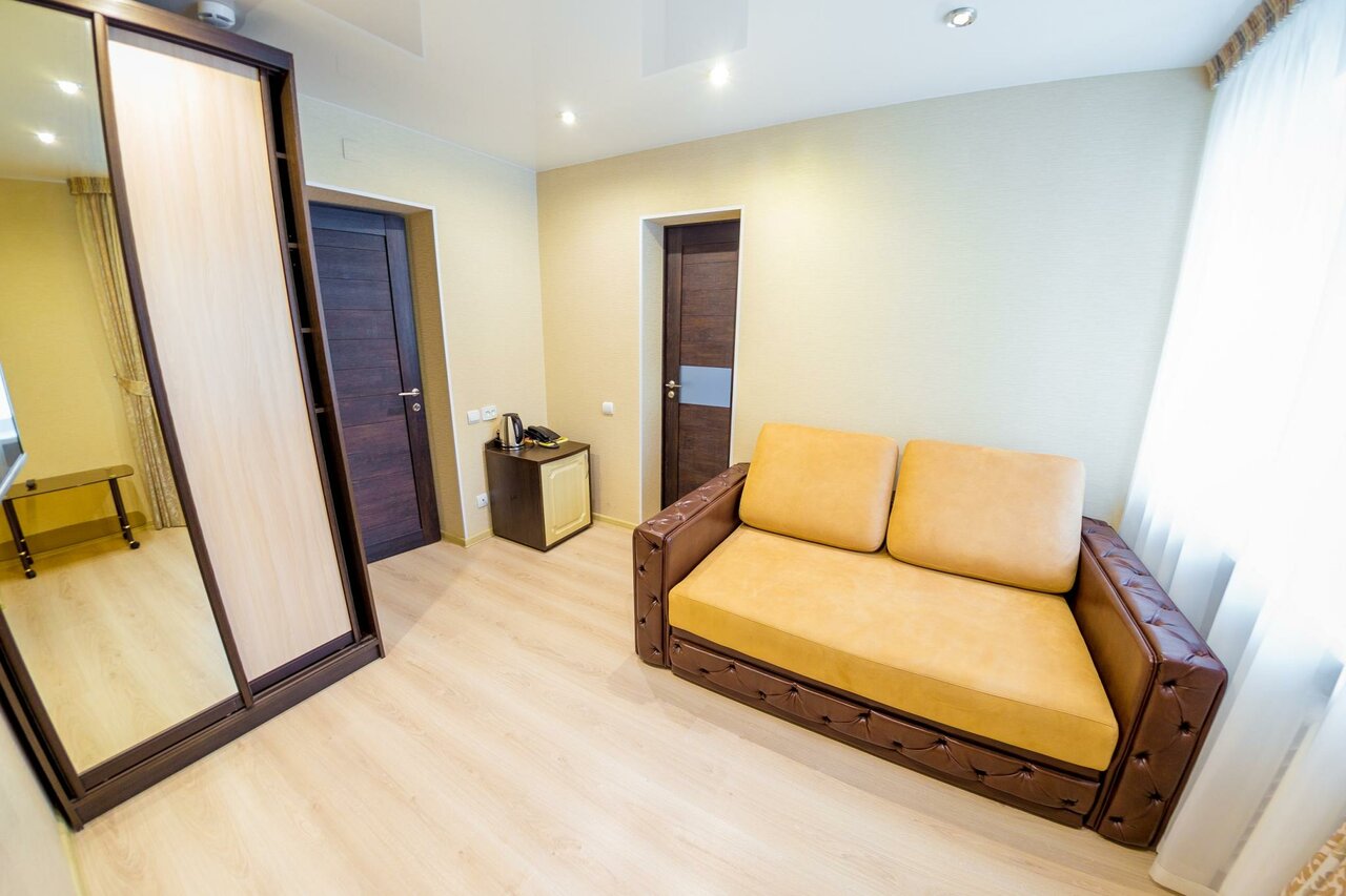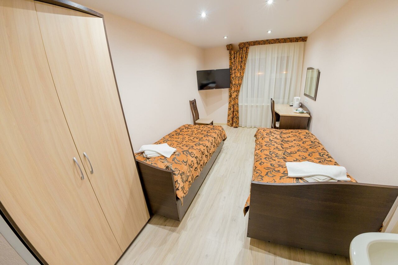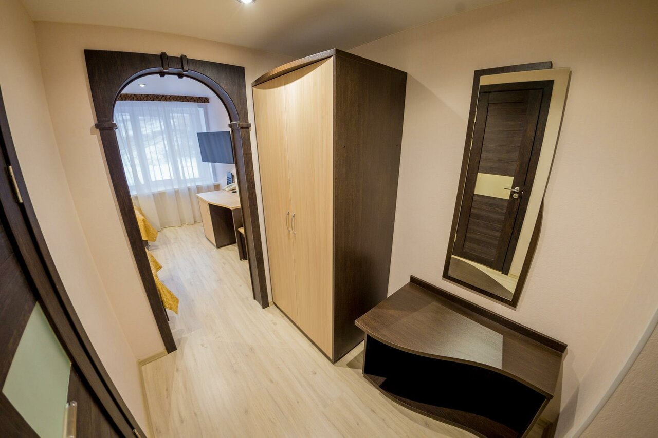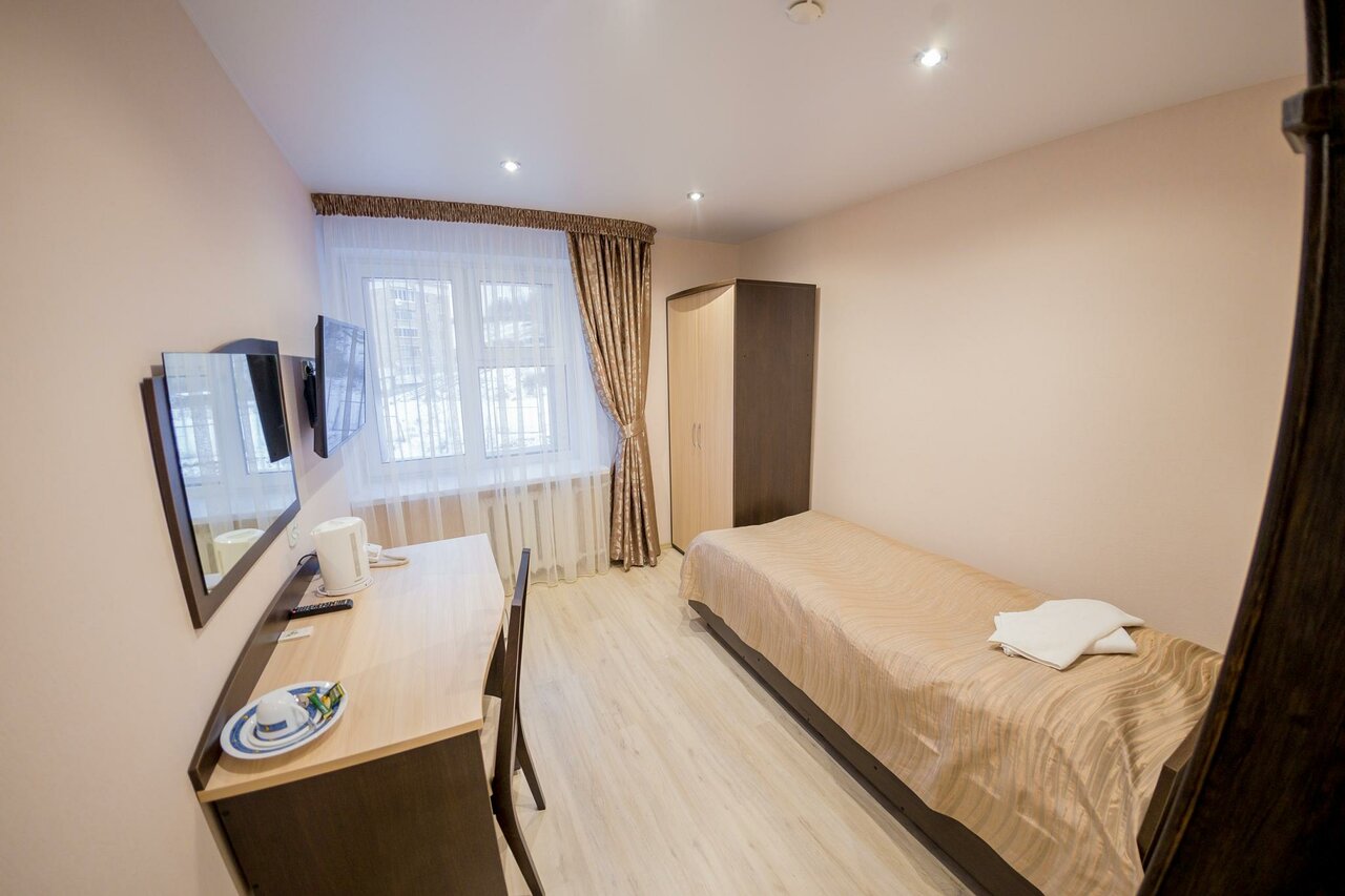 Гостиница хорошо расположена. Рядом остановка, магазин Магнит, Красное и белое. В номере все есть, На втором этаже есть кафешка. Есть 2 лифта. Новый для посетителей и старый ((служебный). Служебный в два раза быстрее.