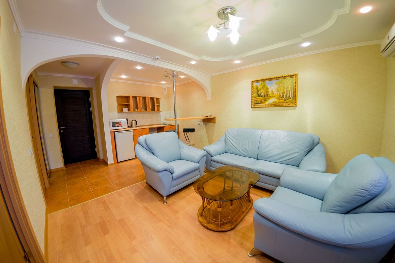 Отель 3*. Жил в двух видах номеров стандарт и по люкс. Стандарт все как обычно кровать тумбочка стол, шкаф, чайник, холодильник. Есть чайный набор и тарелки. В санузле мыло, шампунь, гель для душа. Комнаты средних размеров. А вот полюкс большой, большая двуспальная кровать, мини бар и завтрак. Завтрак через чур скромный, нарезка из сыра и колбас, каша, яишница по запросу, булочки, чай из напитков соки. Овощей и фруктов нет. В принципе все чисто, мебель и обстановка близка к новой.