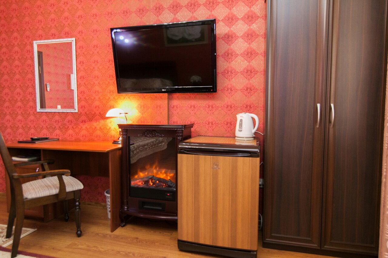 В номере есть все для удобства, зубной набор, тапочки, мыло, гель для душа, шампунь, халат, посуда , чайник и чайный набор, холодильник, кровать удобная, телевизор большой. Завтрак вкусный, заранее заказываете и вам готовят, выбор достаточный. Вполне уютные номера, я жила в 1 номере, там был камин.