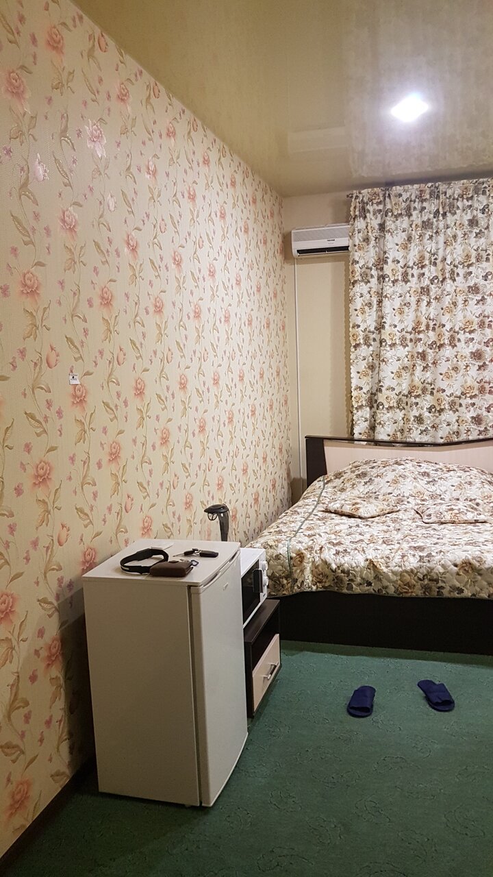 Гостиница не плохая, для переночевать одну ночь. Стоимость 1200 руб за двухместный номер. С телевизором, чайником и кондиционером. Кровати удобные.Микроволновка и холодильник есть в коридоре на этаже. Туалет и душ был на этаже. Возможно есть номера более комфортные, но нам не повезло, всё было занятно.