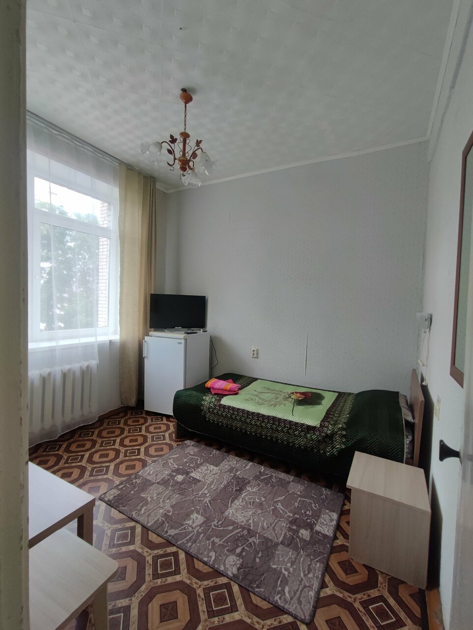 Недорого, но и без всяких изысков. Одноместный номер получше двухместного оказался (с холодильником и просторным гардеробом). Вода с плохим запахом, сантехника ‘еле живая’. В санузле все хлипкое. Полотенца на крючки вешали со страхом, что обломаются. Телевизоры показывают хорошо. Парковка есть.