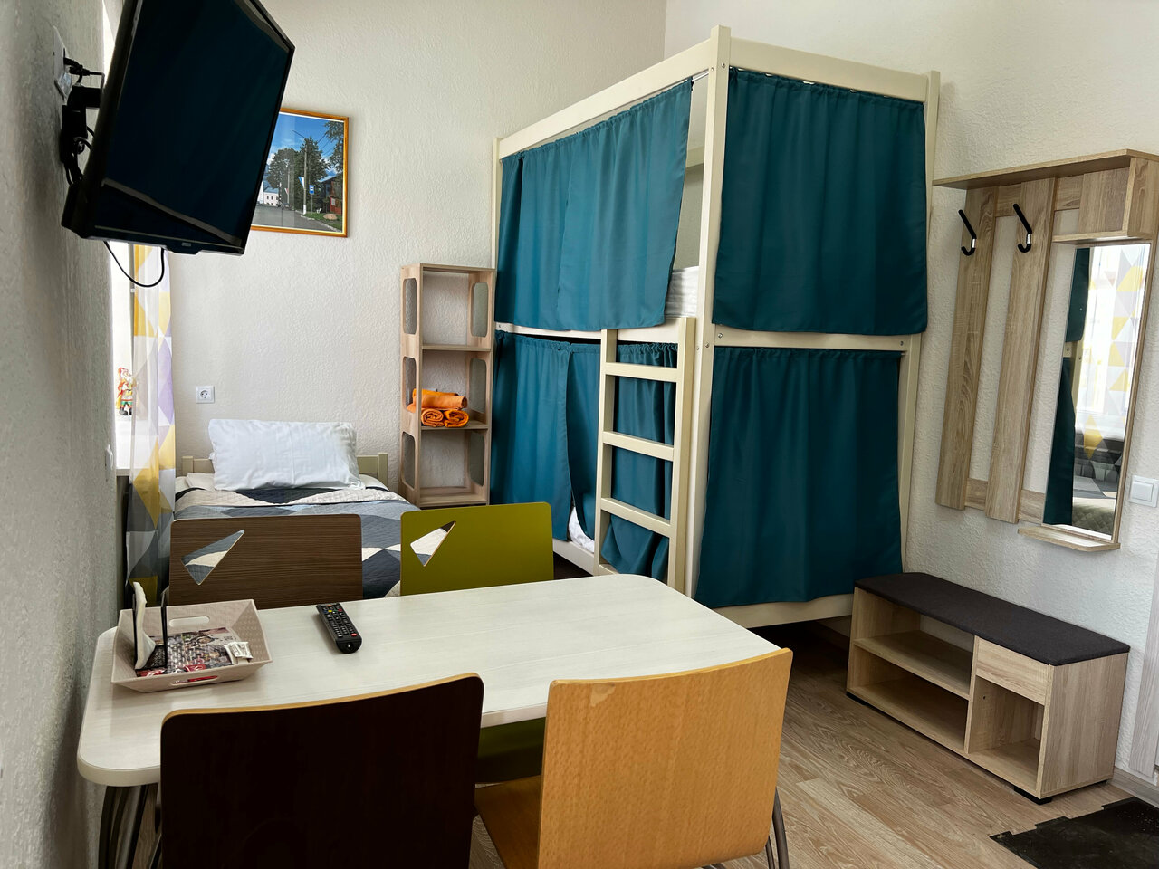 Номер был на первом этаже, стандартный с двумя кроватями. Сам номер нормальный, без изысков, но все есть: холодильник, чайник, микроволновка. Душевая хорошая, однако запах у воды специфический имеется. Из основных проблем это звукоизоляция, по факту ее вообще нет, и когда администратор на стойке разговаривает, вы все прекрасно слышите. При полном заселении будет очень сложно отдыхать. Ночью было тихо и спокойно, но это в не сезон. Завтракать можно в Пятёрочке, которая в этом же здании.
