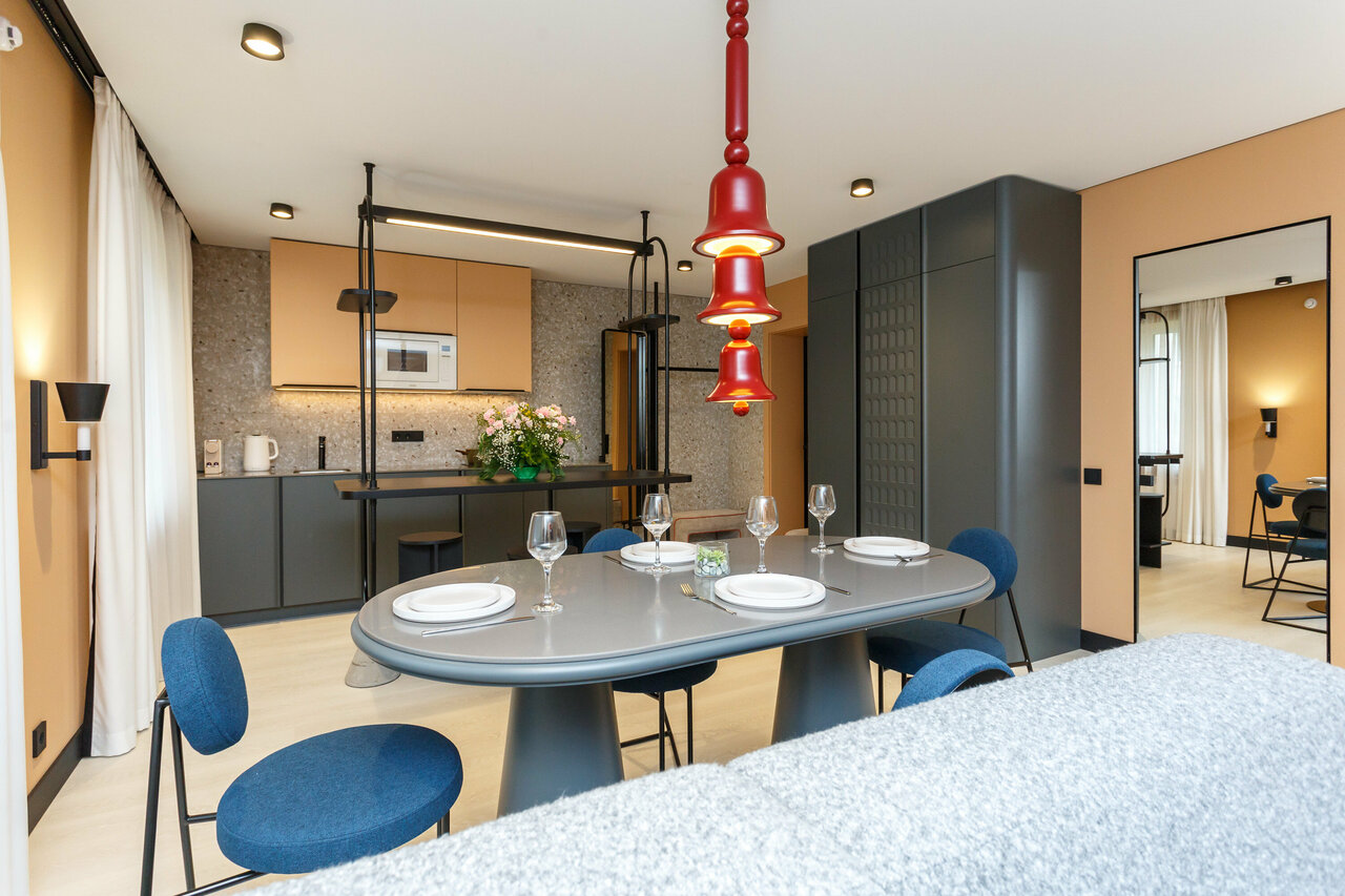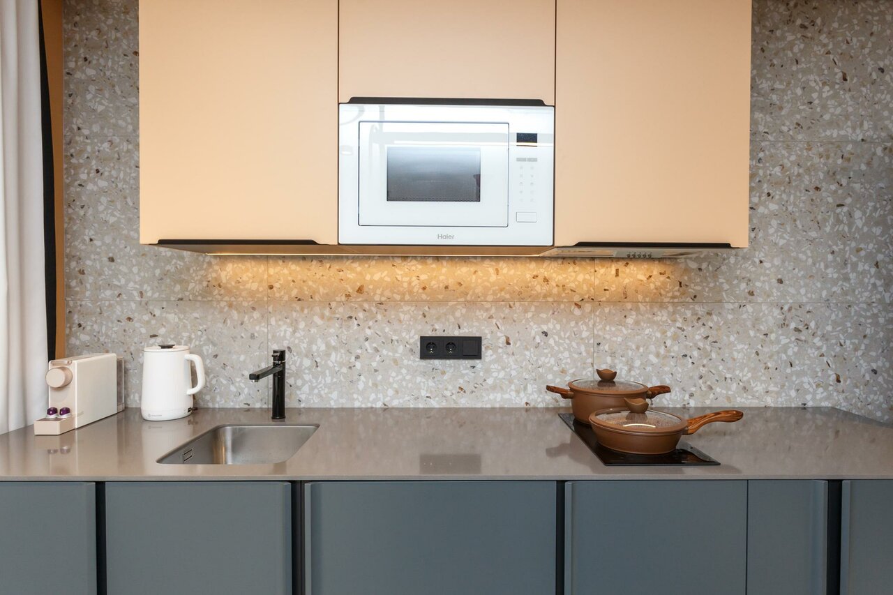 Роскошные дизайнерские двухкомнатные апартаменты (51 м²) с оборудованной кухонной зоной и ванной комнатой. Преимущество: простор и уникальная барная стойка, качественная техника и текстиль. Дистанционная стойка регистрации.