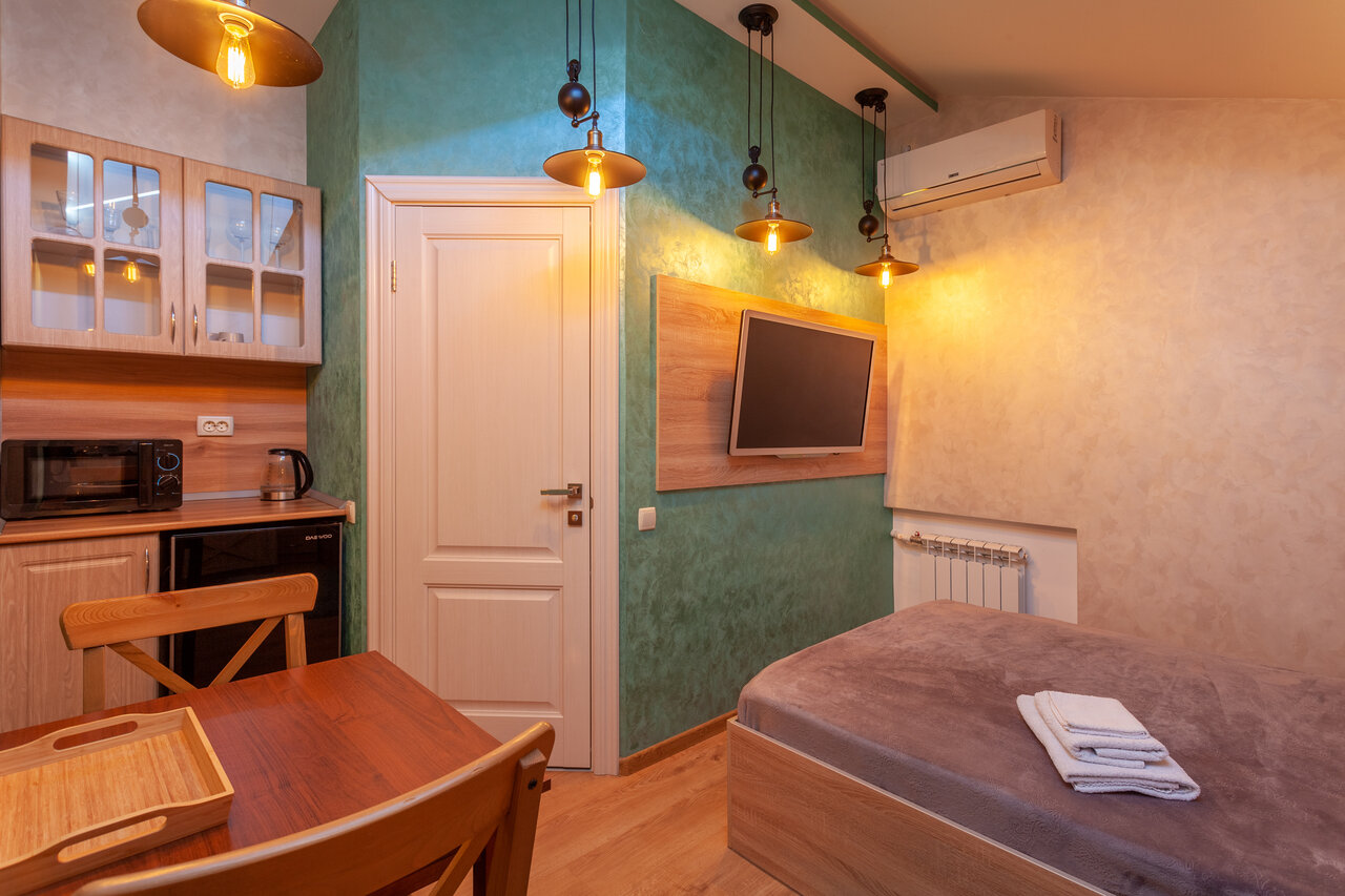 Добро пожаловать в сеть апартаментов «Художники» Данные апартаменты носят название «Ван Гог», пара его репродукций присутствует в деталях интерьера, надеемся выбор картин этого живописца вам понравится.