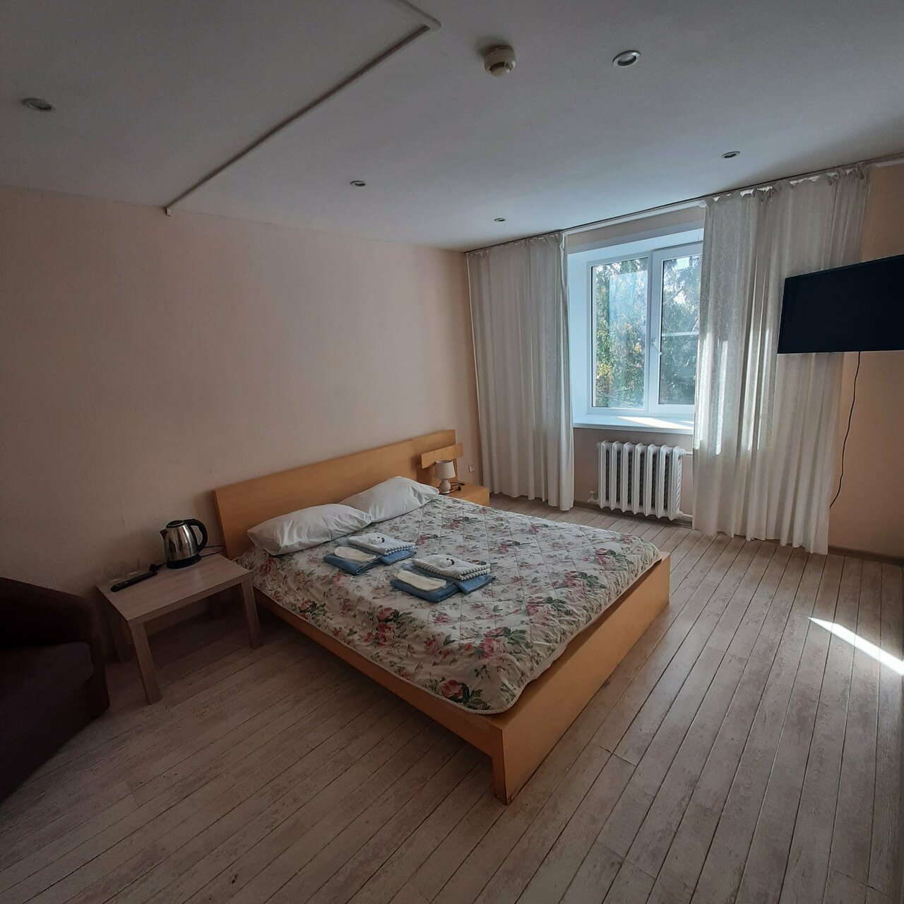Номер нам понравился.Чистый..Постельное белье чисто .Телевизор стоял на общем коридоре.Вид с окна красивый.Одно было не удобно,что чайника в номере не было.Но нас это не растроело т.к мы ходили за кипятком на 1 этаж общей кухни.Расположение удачное т. к до Кремля пешком 5-10 минут.Не долеко есть магазин ‘Магнит’,рынок