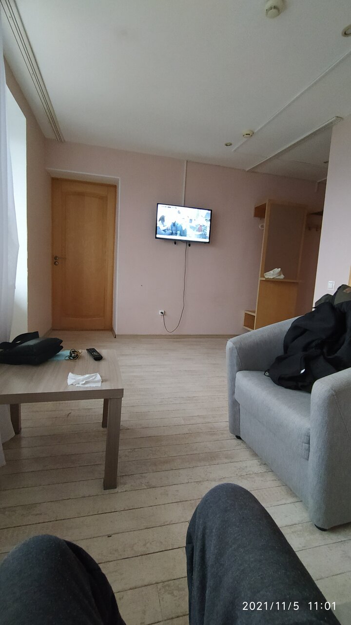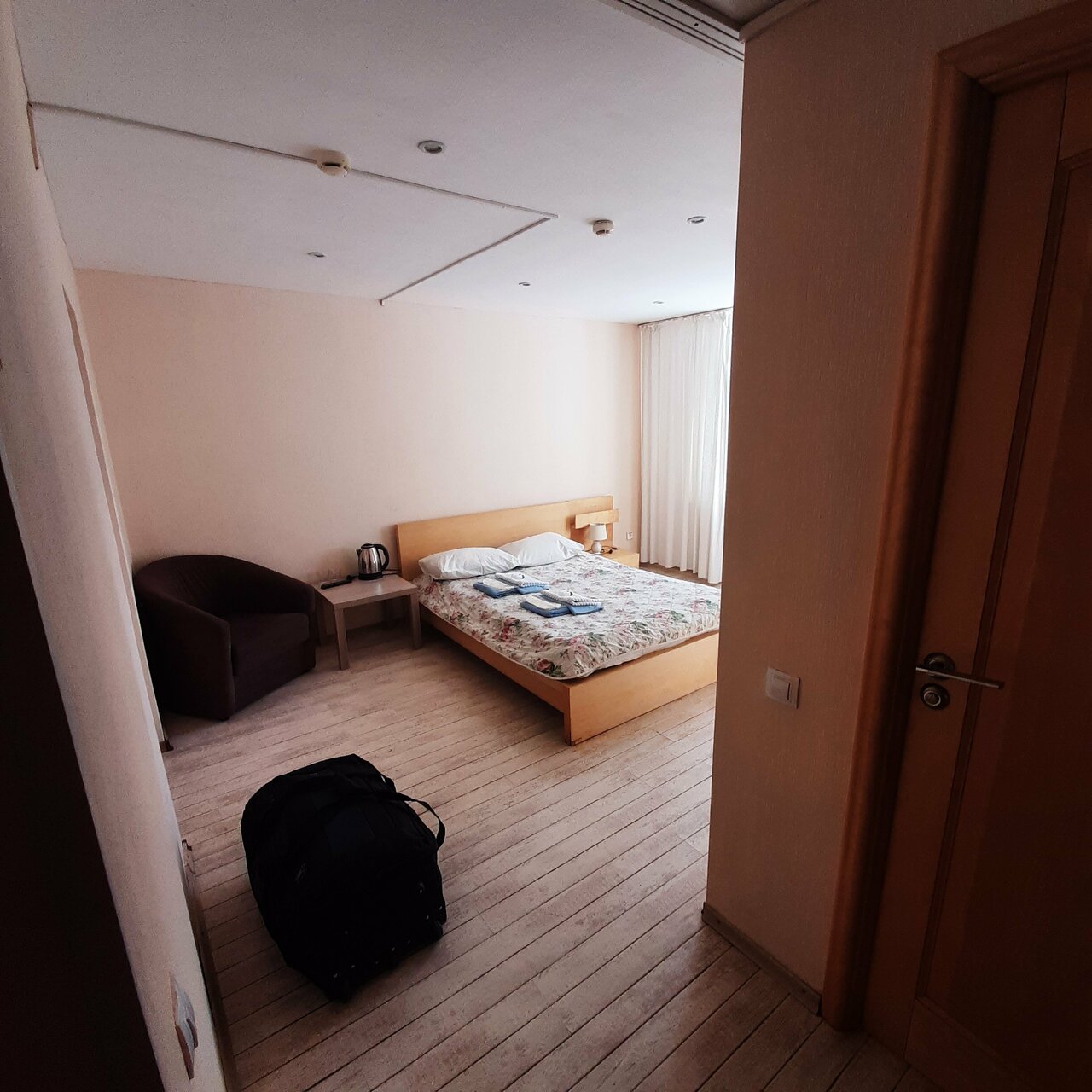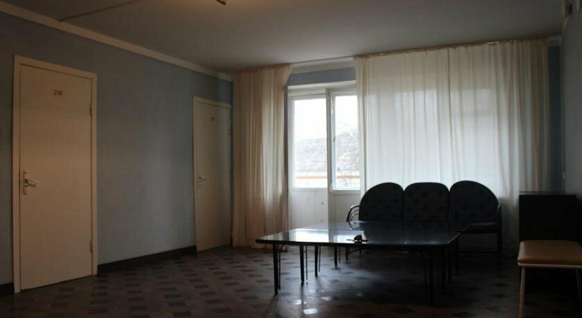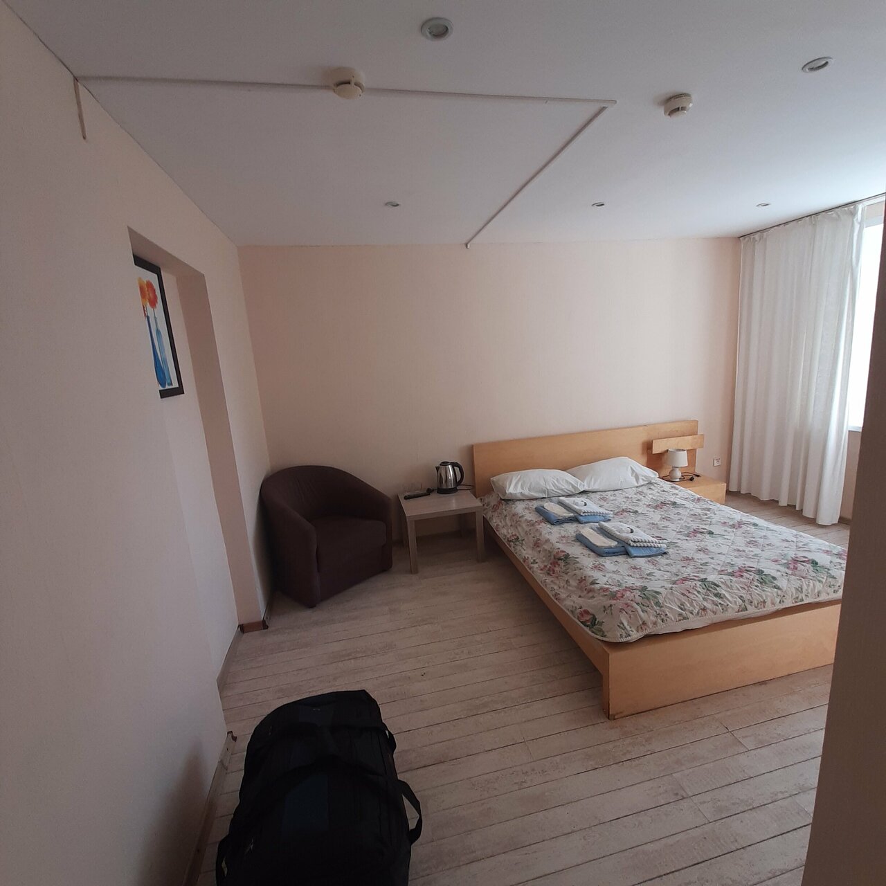 Жили в 4-х местном номере, со своей военной комнатой. Из плюсов — есть парковка, рядом кремль, магазин сувениров, продуктовый и кафе. Ежедневная уборка отсутствует, кондиционера нет — душно и комары. С вентиляцией вообще в гостинице проблемы — духота и запахи постоянные. Своих денег номер не стоит. Позабавил балкон с панорамным окном в туалете: сидишь на унитазе и смотришь в парк. Парк смотрит на тебя.