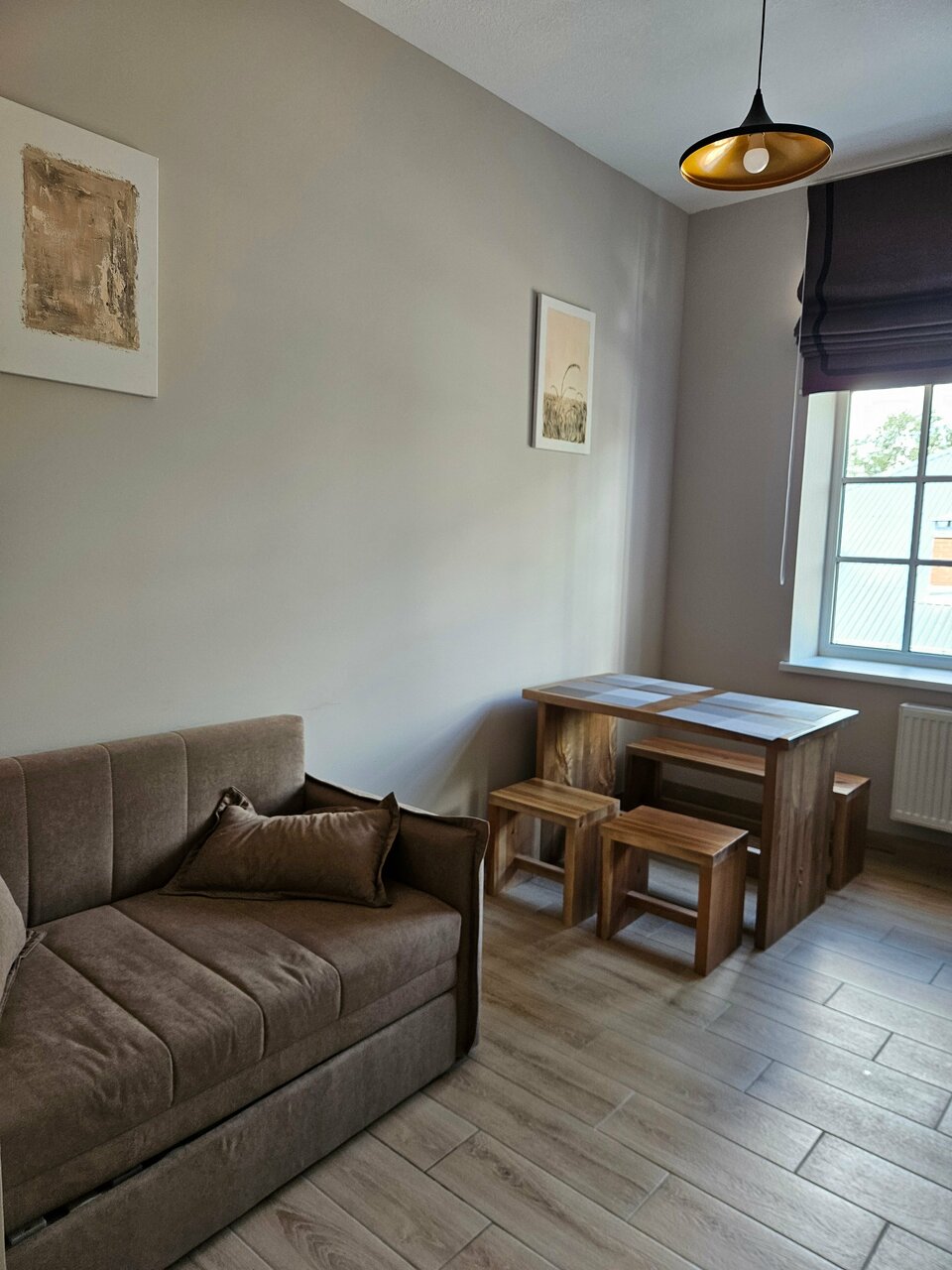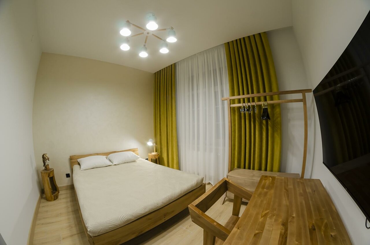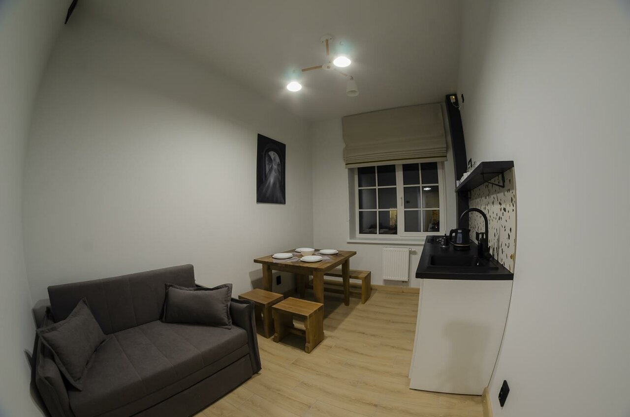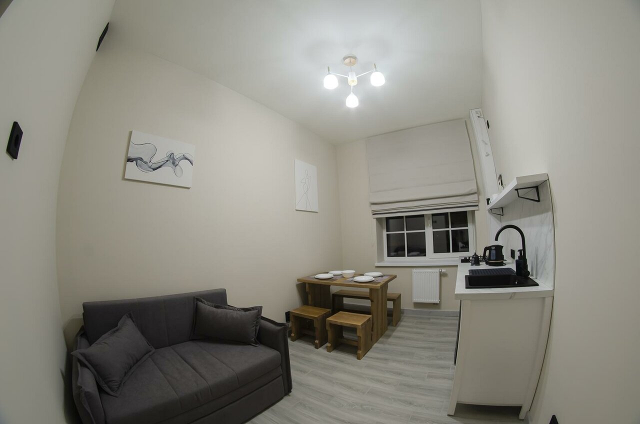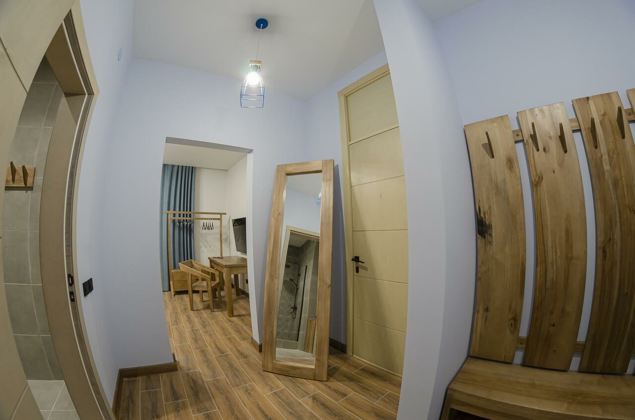 Удобное месторасположение, тихое место, красивый вид из окна. Номер просторный, чисто. Семейный номер предлагается для 4 гостей, но дополнительный диван узковат для двоих, для троих номер замечательный. Небольшая кухня с необходимым набором посуды. Чисто. Стильный интерьер. Минус — нет кондиционера. В шаговой доступности несколько магазинов, кафе.