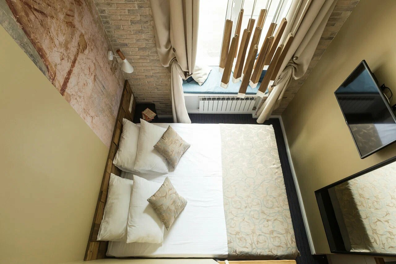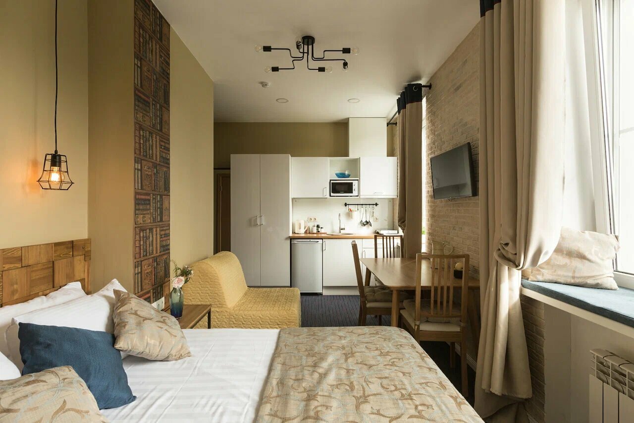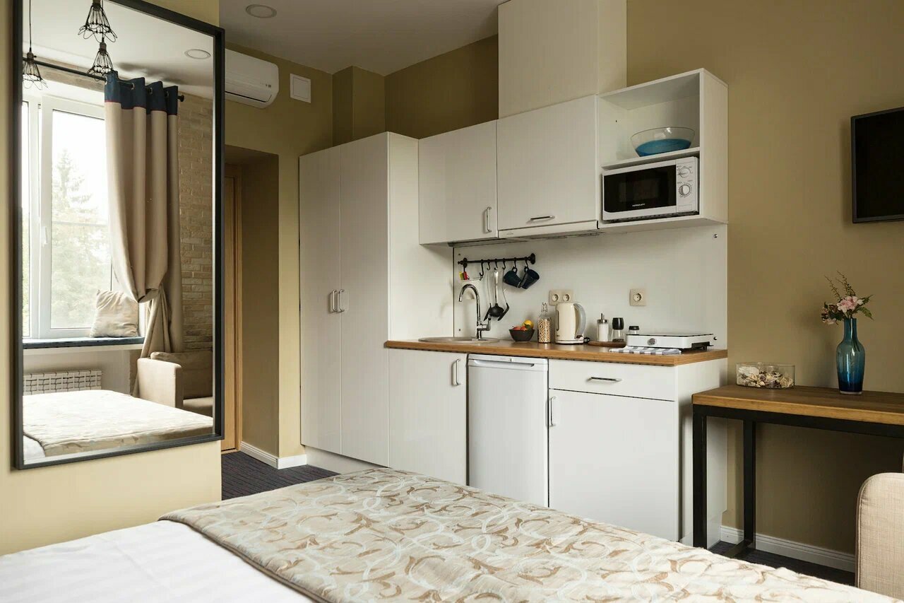 Отличный апарт-отель! Плюсы: Очень приветливый персонал. Спасибо большое! В номере есть всё необходимое. Новый ремонт. Каждый день уборка и смена полотенец. Есть платный мини бар. Вода бесплатная . Встроенный фильтр. Можно заказать завтраки из соседнего кафе за 500р. Можно с животными. Отель расположен ближе всех к Кремлю. Можно заказать трансфер. Минусы: Незначительные, но справедливости ради напишу и о них. Нет лифта. Если окна на улицу, то слышны машины. Но движение небольшое, и всё же, вид на парк и Кремль важнее. Из-за того, что вода нагревается бойлером, то сложно отрегулировать ее температуру. В целом отдых в этом отеле был комфортный!