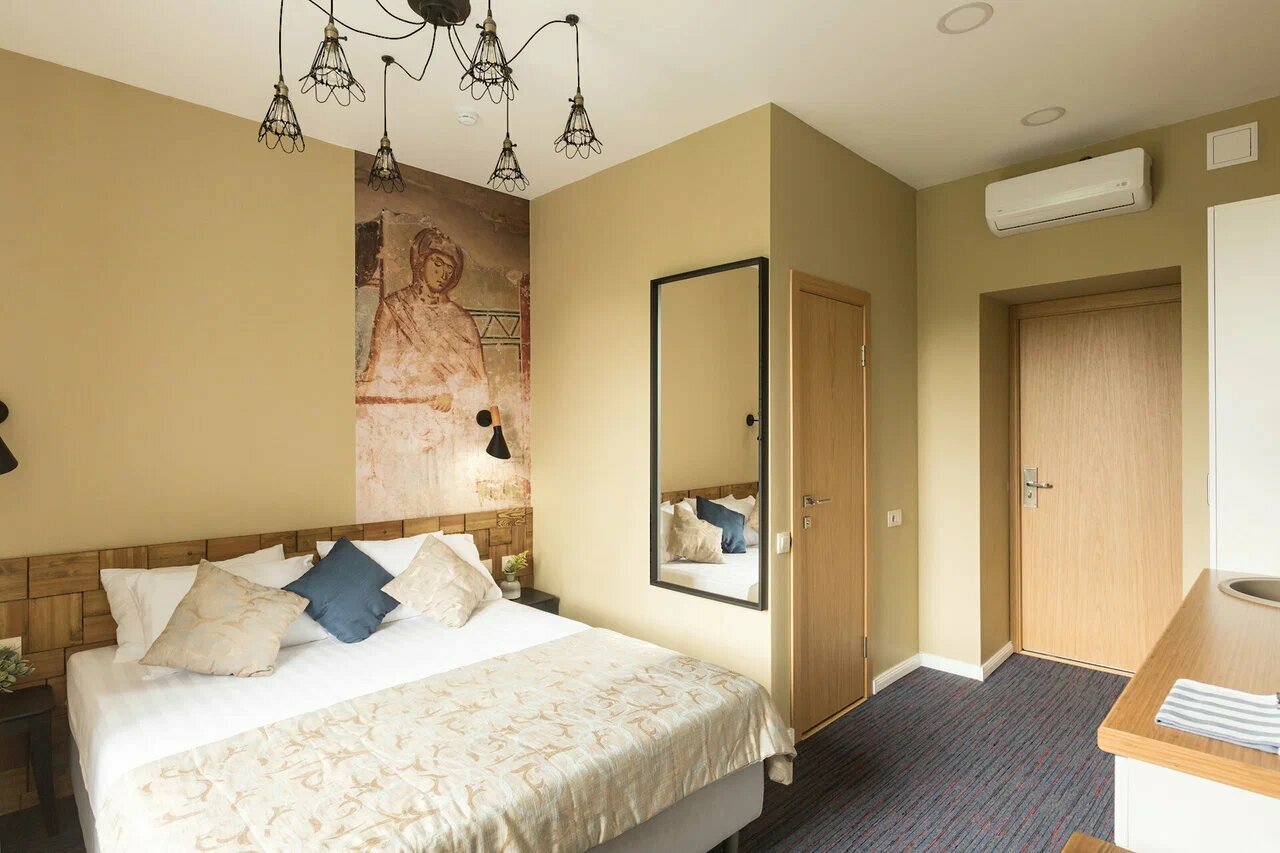 Прекрасный отель! Номер — мини апартаменты в стиле лофт, небольшой, но всё есть, даже маленькая плиточка, микроволновка, посуда, сейф, фен… Удобнейшее расположение напротив парка и Кремля. Рядом рестораны Телеграф (немного тормознутые по обслуживанию, но было вкусно) и География (там больше понравилось). Также завтрак можно заказать в гостинице (привозят из ресторана). Дают карточку для бесплатной парковки на платном паркинге у парка. Милые девушки-администраторы. А самое главное — мощный и тихий кондиционер! (в жару 40 градусов был очень актуален, специально искали отель с кондиционером, в Новгороде их практически нет). Единственный нюанс -в здании нет лифта, тяжеловато было подниматься на 4-й этаж с чемоданом.